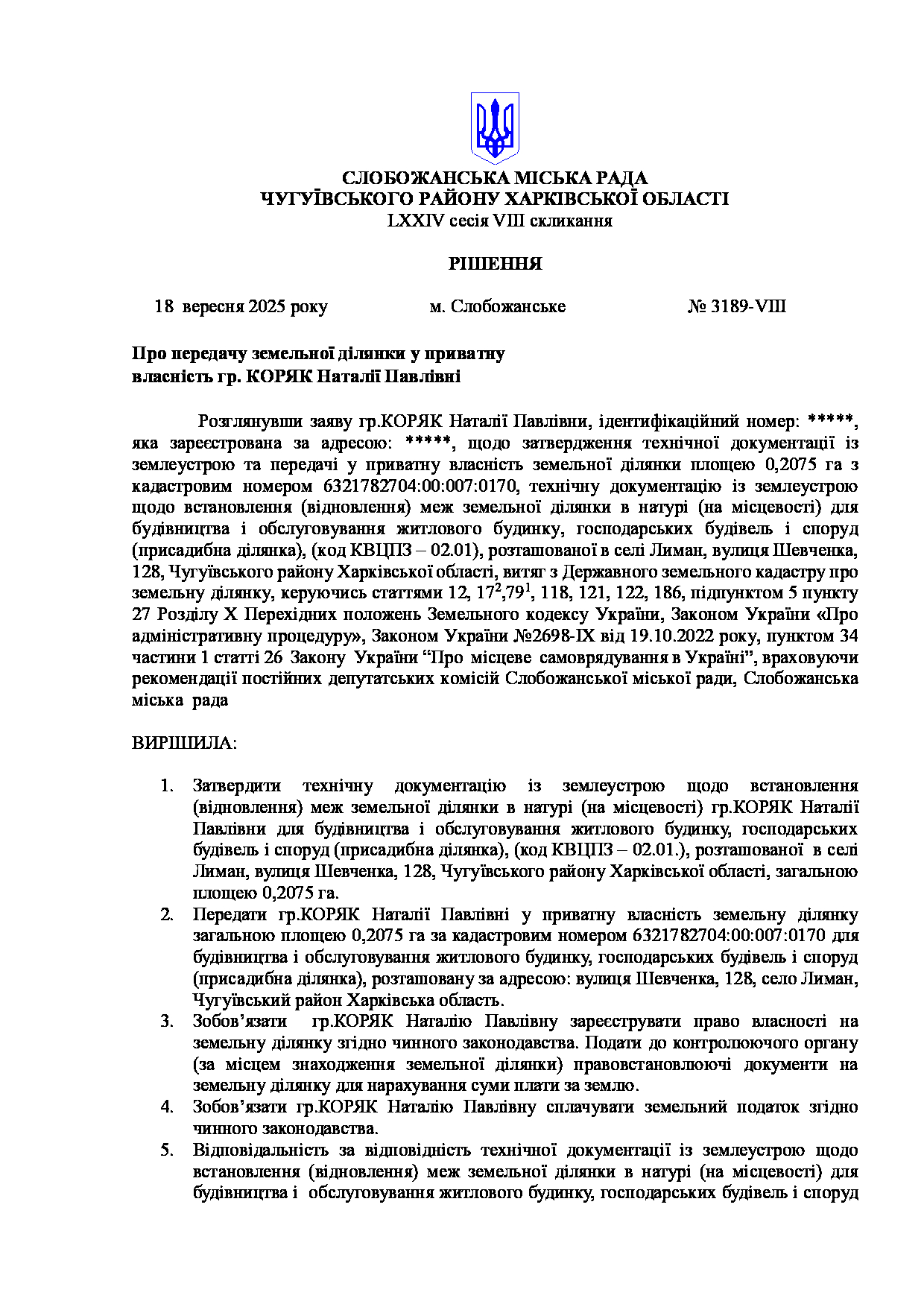 Текст рішення сесії №3189 Про передачу земельної ділянки у приватну власність гр. КОРЯК Наталії Павлівні.