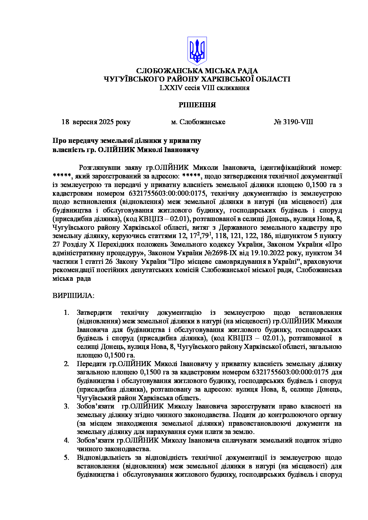 Текст рішення сесії №3190 Про передачу земельної ділянки у приватну власність гр. ОЛІЙНИК Миколі Івановичу.