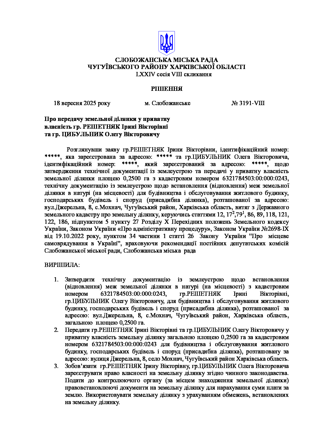 Текст рішення сесії №3191 Про передачу земельної ділянки у приватну власність гр. РЕШЕТНЯК Ірині Вікторівні та гр. ЦИБУЛЬНИК Олегу Вікторовичу.