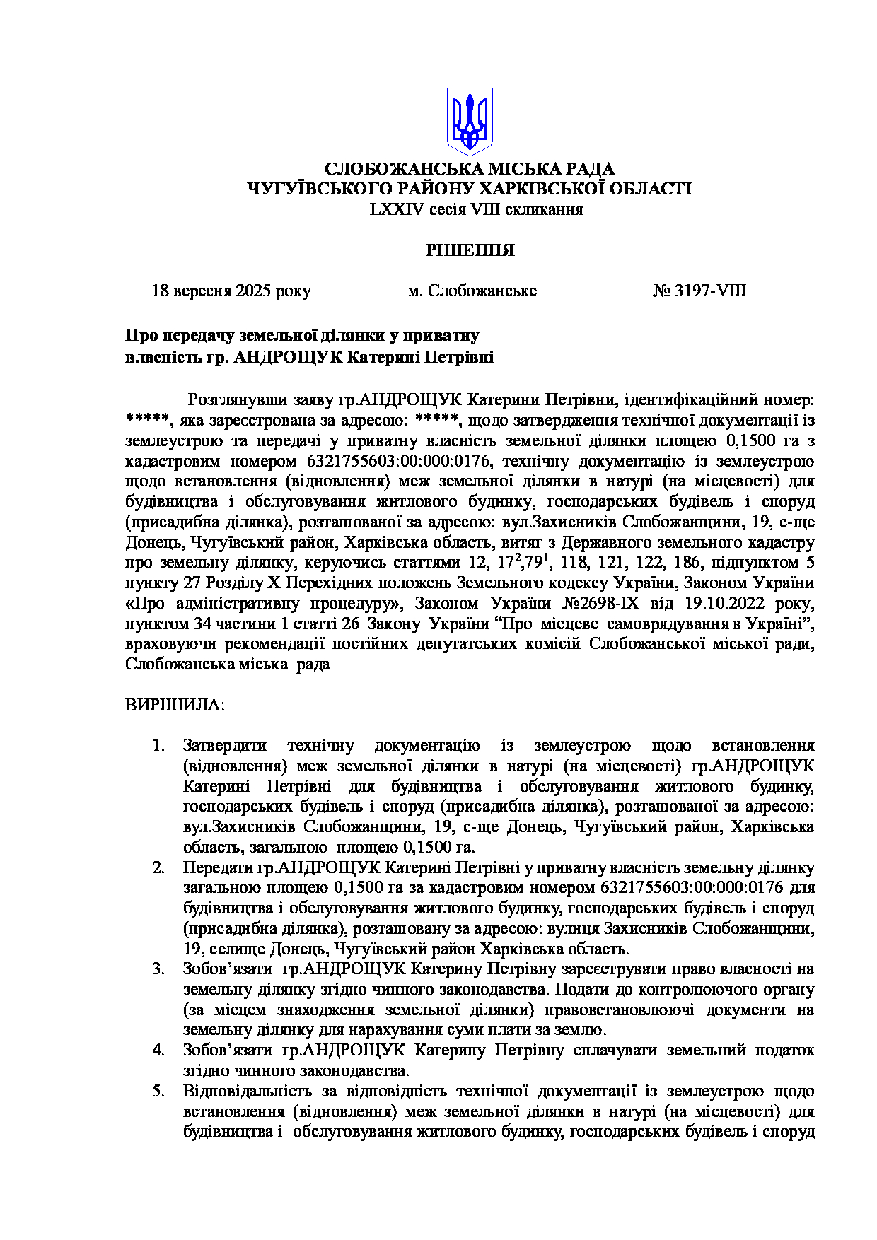 Текст рішення сесії №3197 Про передачу земельної ділянки у приватну власність гр. АНДРОЩУК Катерині Петрівні.