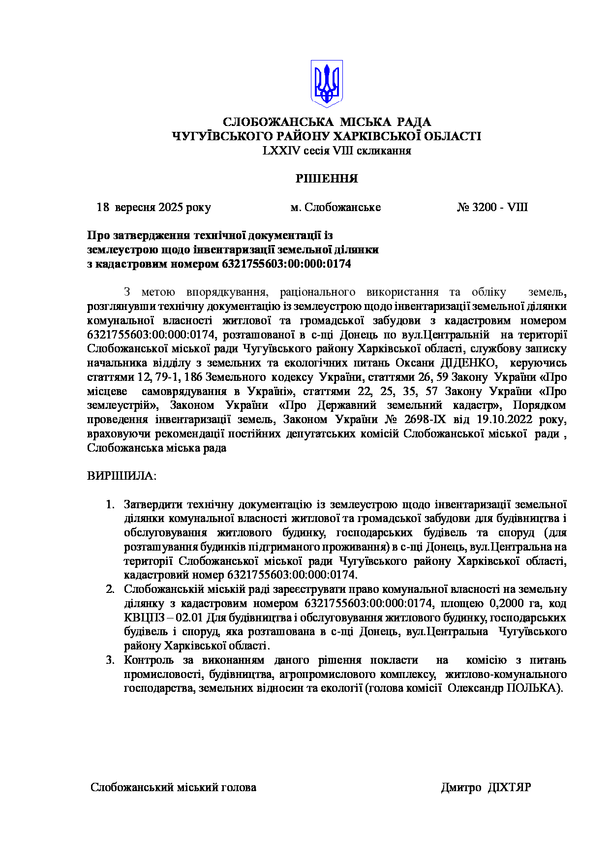 Текст рішення сесії №3200 Про затвердження технічної документації із землеустрою щодо інвентаризації земельної ділянки з кадастровим номером 6321755603:00:000:0174.