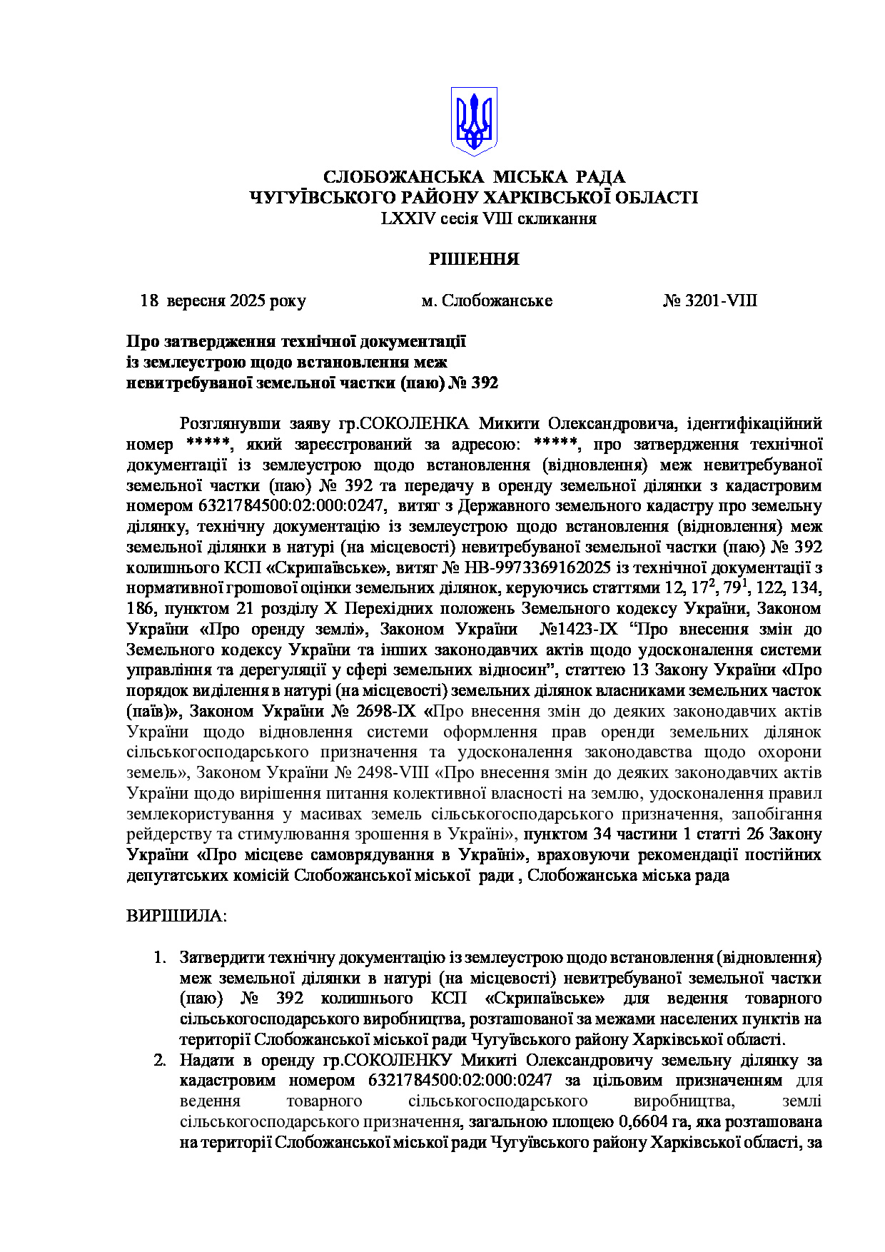 Текст рішення сесії №3201 Про затвердження технічної документації із землеустрою щодо встановлення меж невитребуваної земельної частки (паю) № 392.