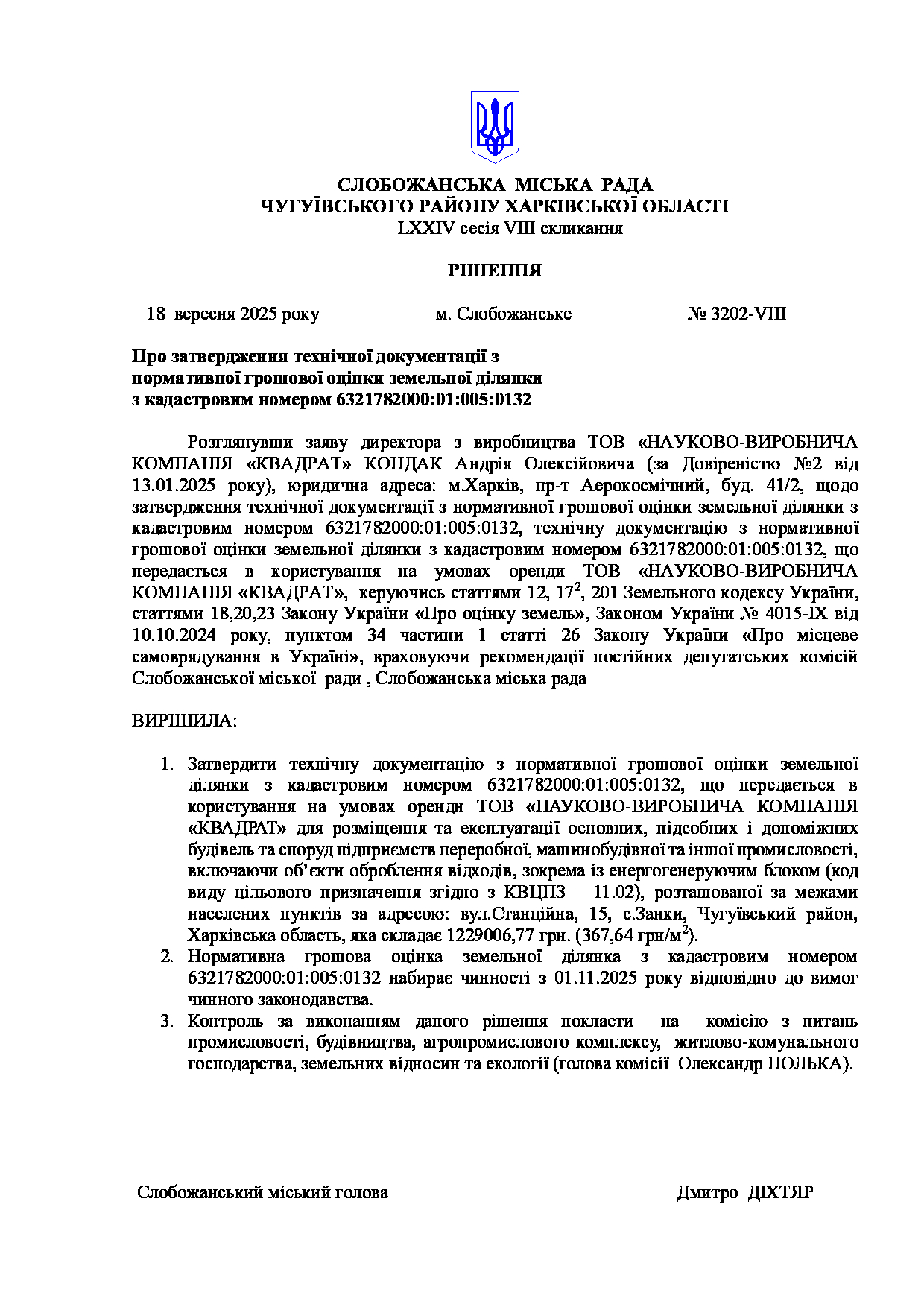 Текст рішення сесії №3202 Про затвердження технічної документації з нормативної грошової оцінки земельної ділянки з кадастровим номером 6321782000:01:005:0132.