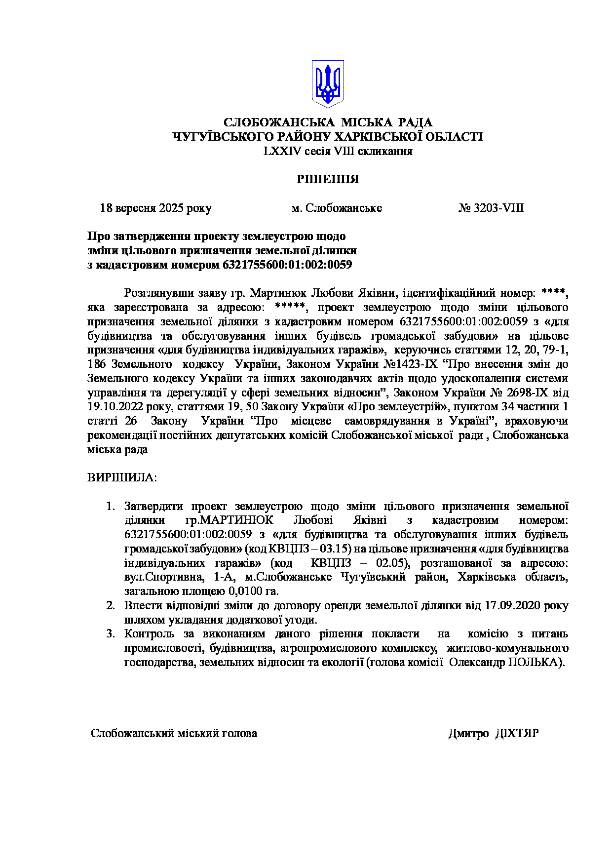 Текст рішення сесії №3203 Про затвердження проекту землеустрою щодо зміни цільового призначення земельної ділянки з кадастровим номером 6321755600:01:002:0059.
