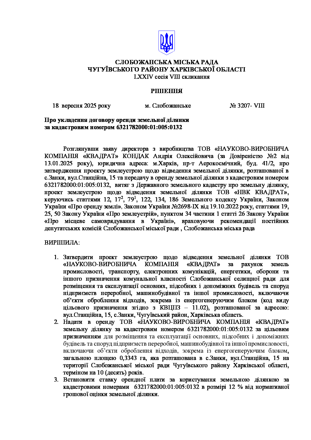 Текст рішення сесії №3207 Про укладення договору оренди земельної ділянки за кадастровим номером 6321782000:01:005:0132.