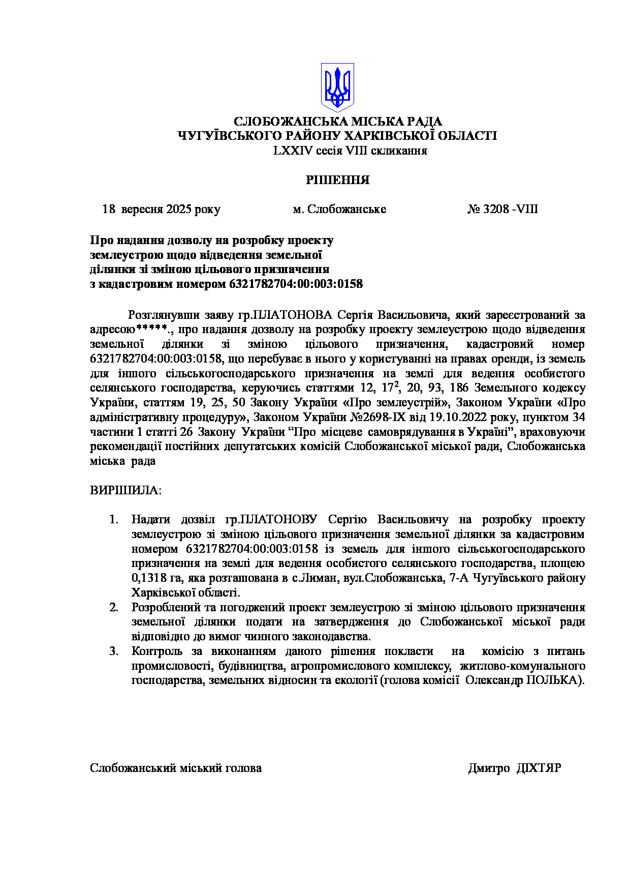 Текст рішення сесії №3208 Про надання дозволу на розробку проекту землеустрою щодо відведення земельної ділянки зі зміною цільового призначення з кадастровим номером 6321782704:00:003:0158.