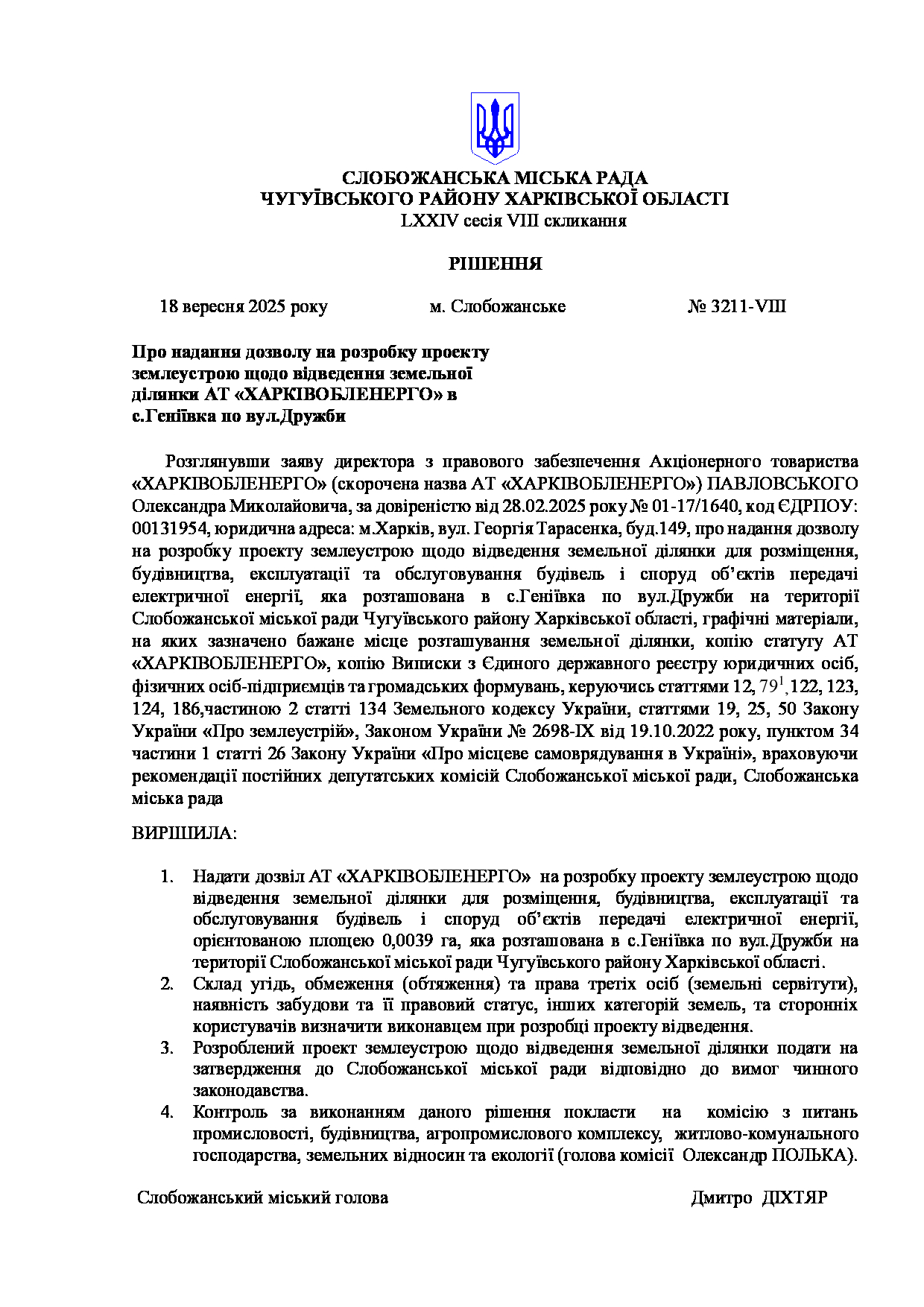 Текст рішення сесії №3211 Про надання дозволу на розробку проекту землеустрою щодо відведення земельної ділянки АТ «ХАРКІВОБЛЕНЕРГО» в с.Геніївка по вул.Дружби.