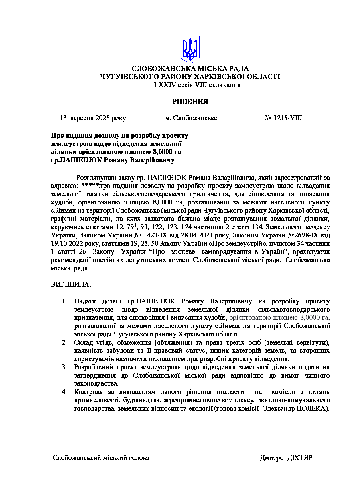 Текст рішення сесії №3215 Про надання дозволу на розробку проекту землеустрою щодо відведення земельної ділянки орієнтованою площею 8,0000 га гр.ПАШЕНЮК Роману Валерійовичу.