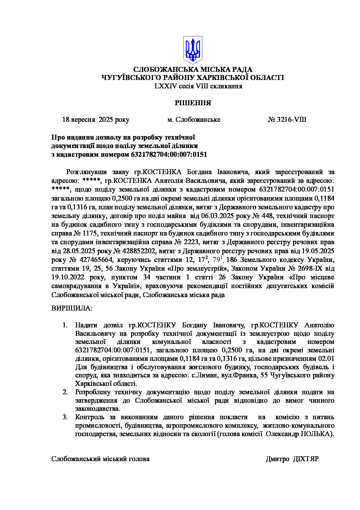 Текст рішення сесії №3216 Про надання дозволу на розробку технічної документації щодо поділу земельної ділянки з кадастровим номером 6321782704:00:007:0151.
