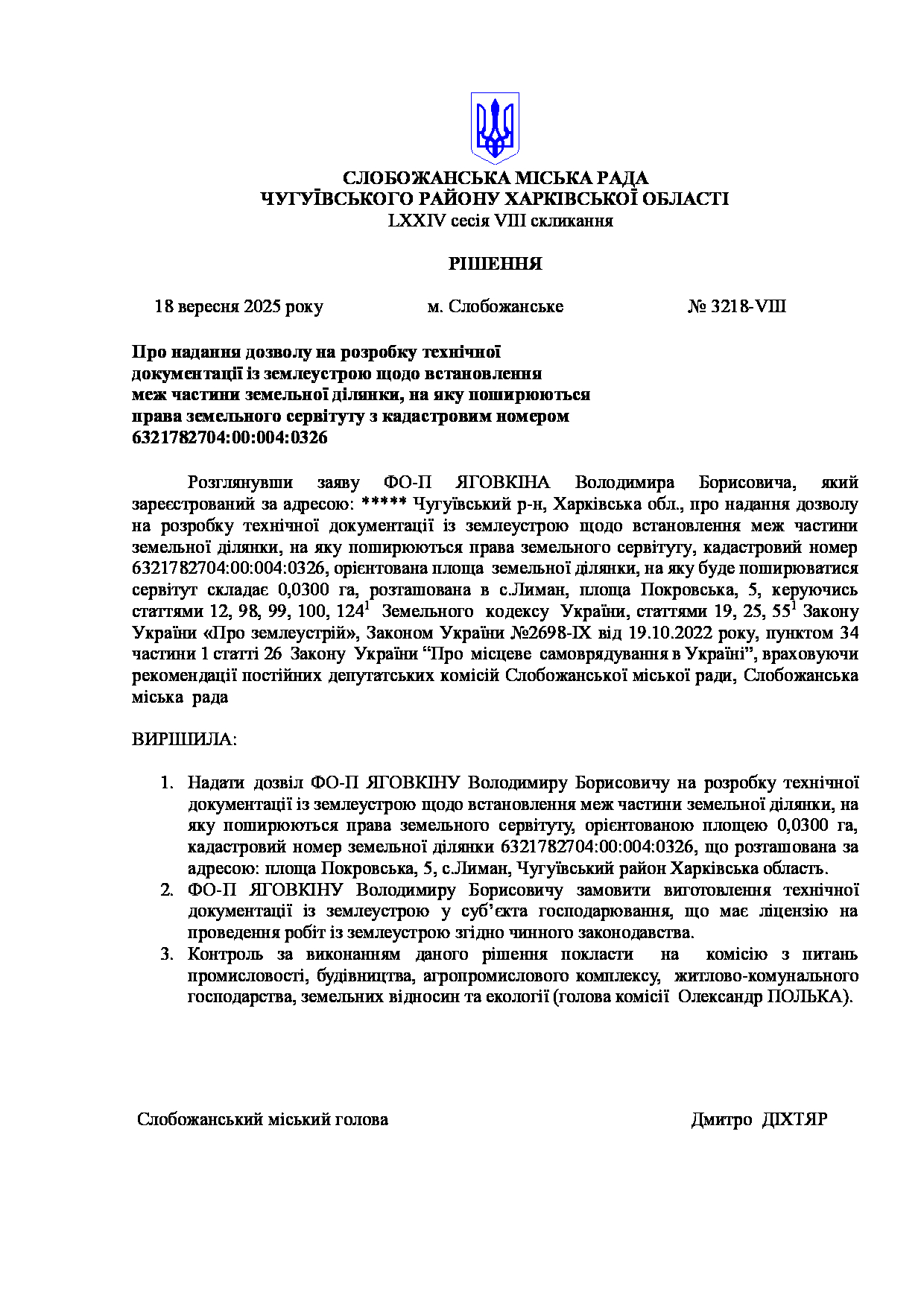 Текст рішення сесії №3218 Про надання дозволу на розробку технічної документації із землеустрою щодо встановлення меж частини земельної ділянки, на яку поширюються права земельного сервітуту з кадастровим номером 6321782704:00:004:0326.