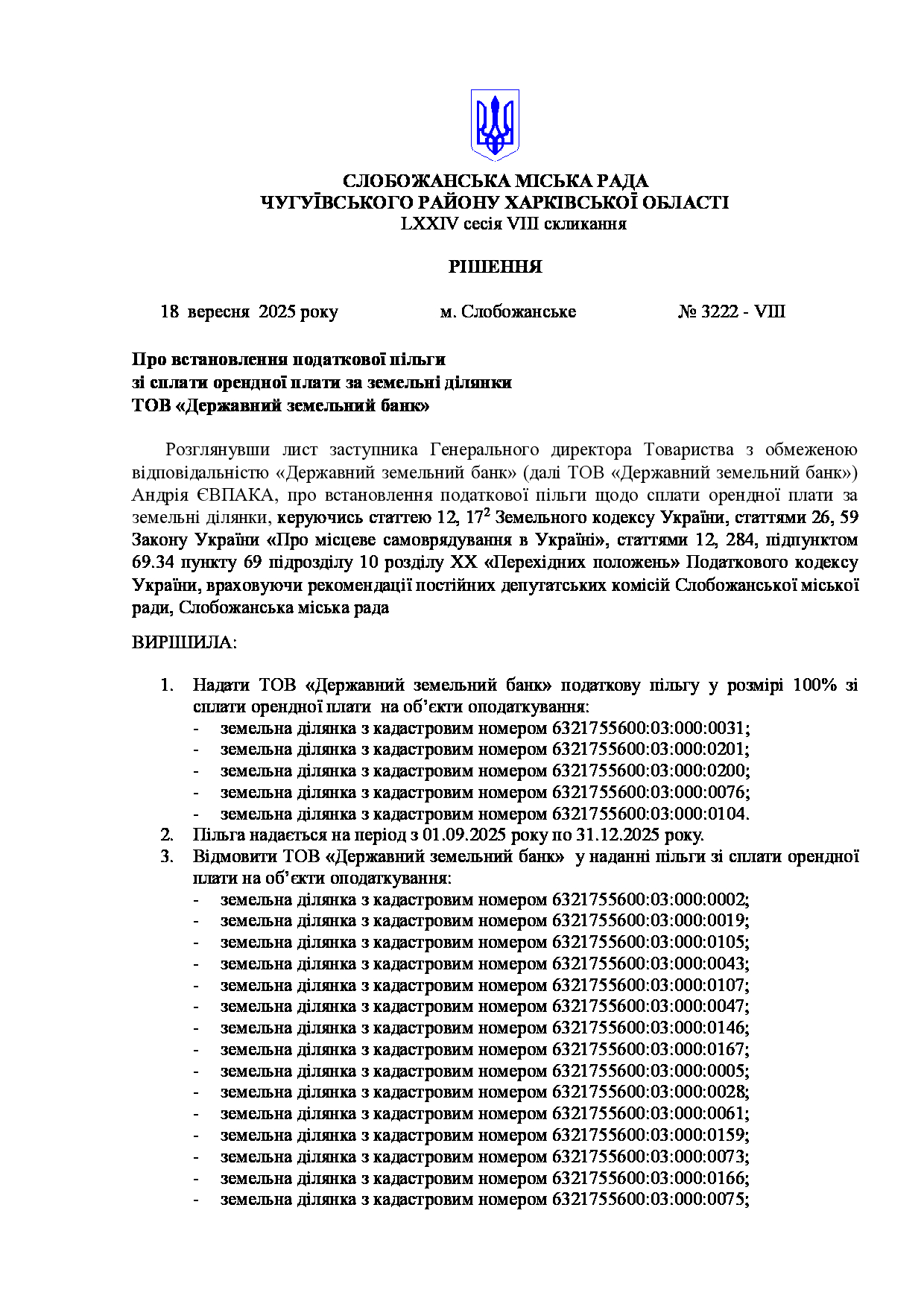 Текст рішення сесії №3222 Про встановлення податкової пільги зі сплати орендної плати за земельні ділянки ТОВ «Державний земельний банк».