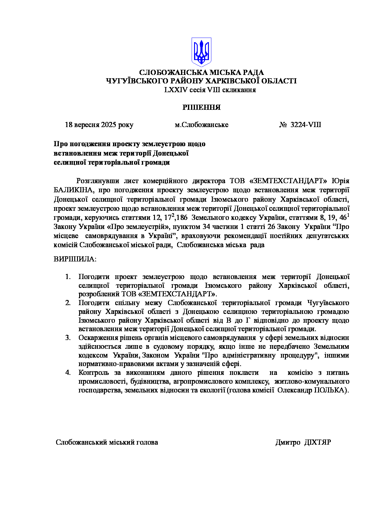 Текст рішення сесії №3224 Про погодження проекту землеустрою щодо встановлення меж території Донецької селищної територіальної громади.