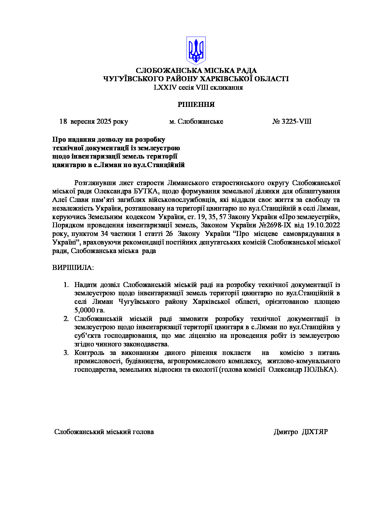 Текст рішення сесії №3225 Про надання дозволу на розробку технічної документації із землеустрою щодо інвентаризації земель території цвинтарю в с. Лиман по вул. Станційній.