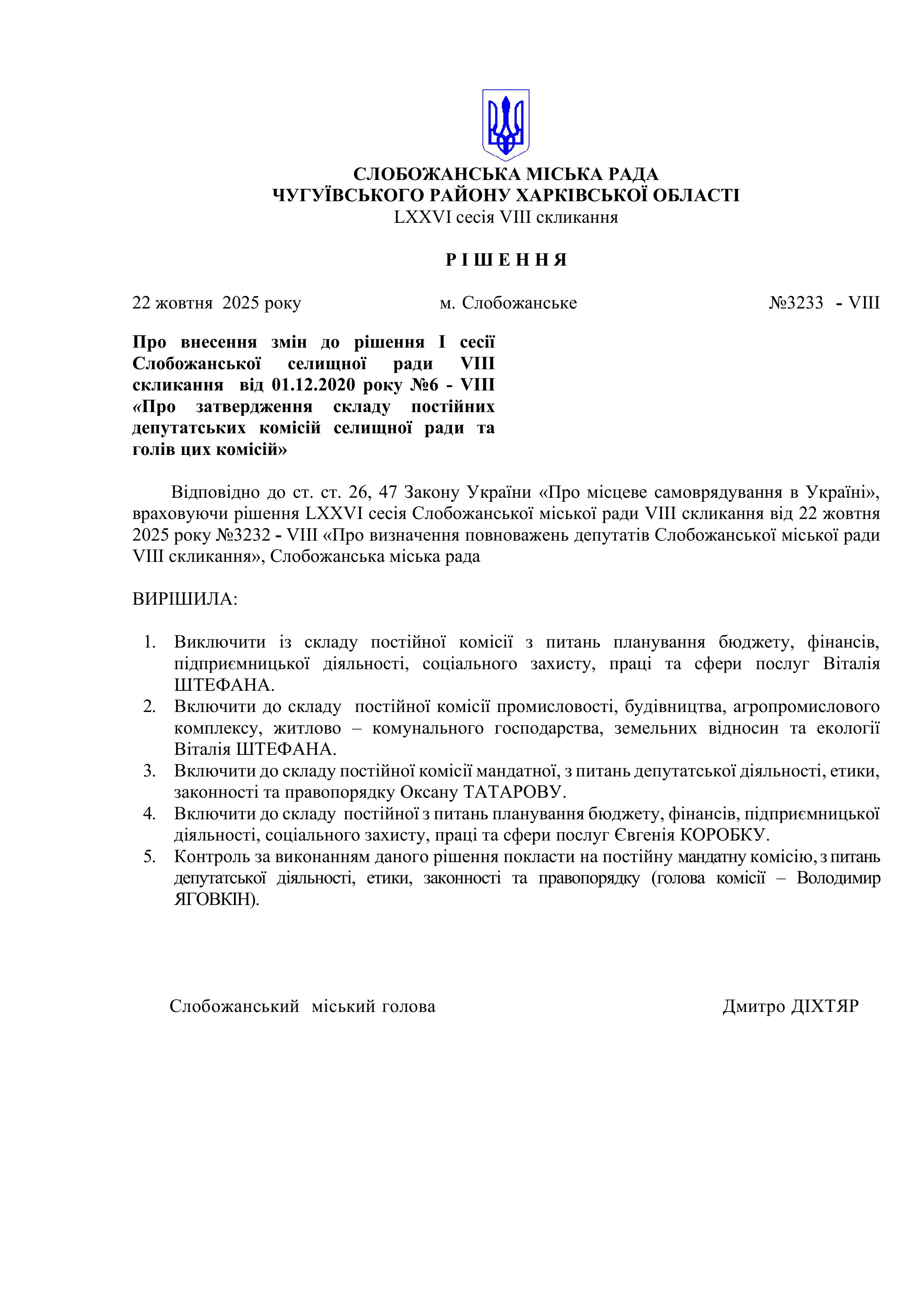 Текст рішення сесії №3233 Про внесення змін до рішення І сесії Слобожанської селищної ради VІІI скликання від 01.12.2020 року №6 - VІІI «Про затвердження складу постійних депутатських комісій селищної ради та голів цих комісій».