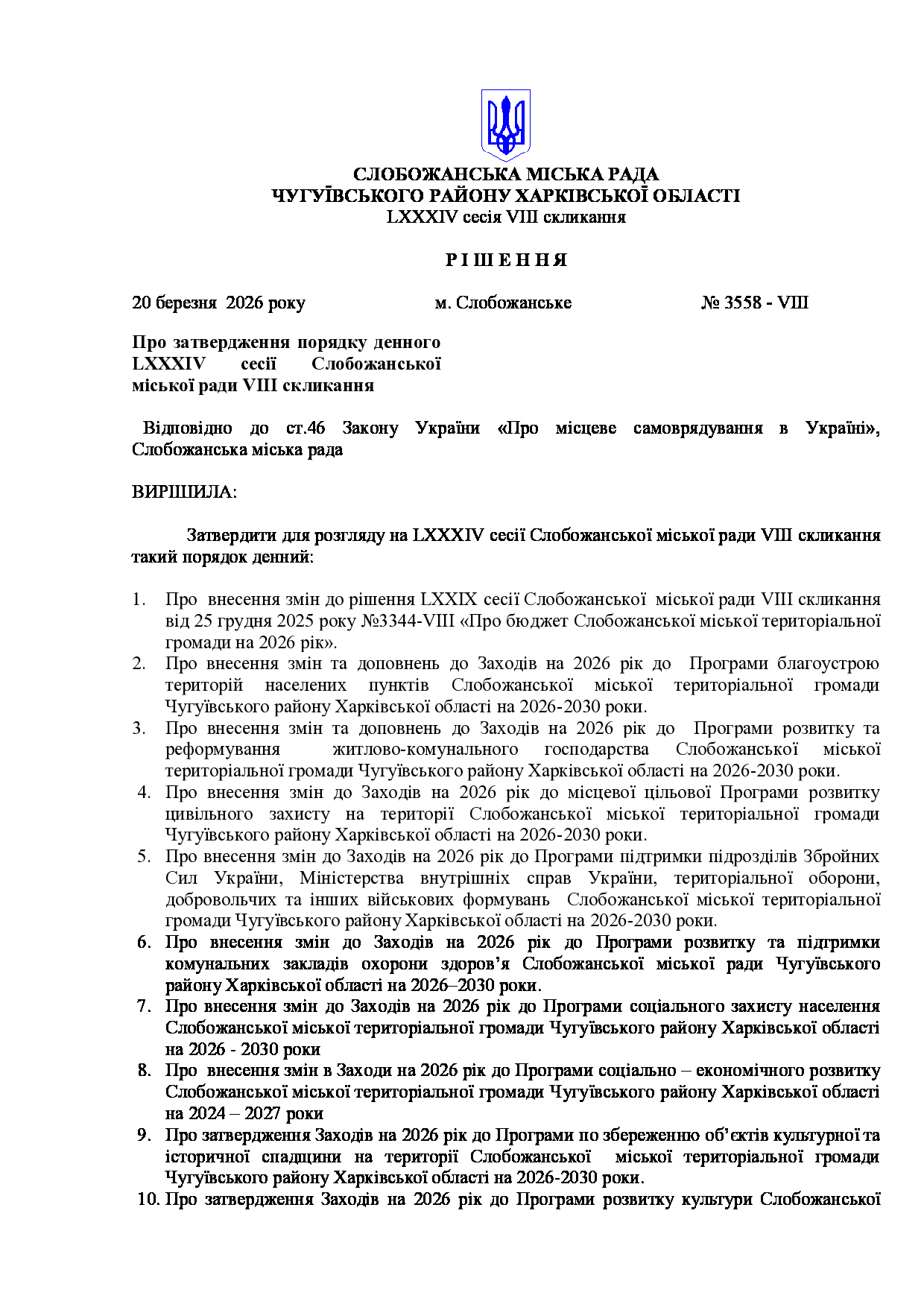Текст рішення сесії №3558 Про затвердження порядку денного LXXXIV сесії Слобожанської міської ради VІІІ скликання