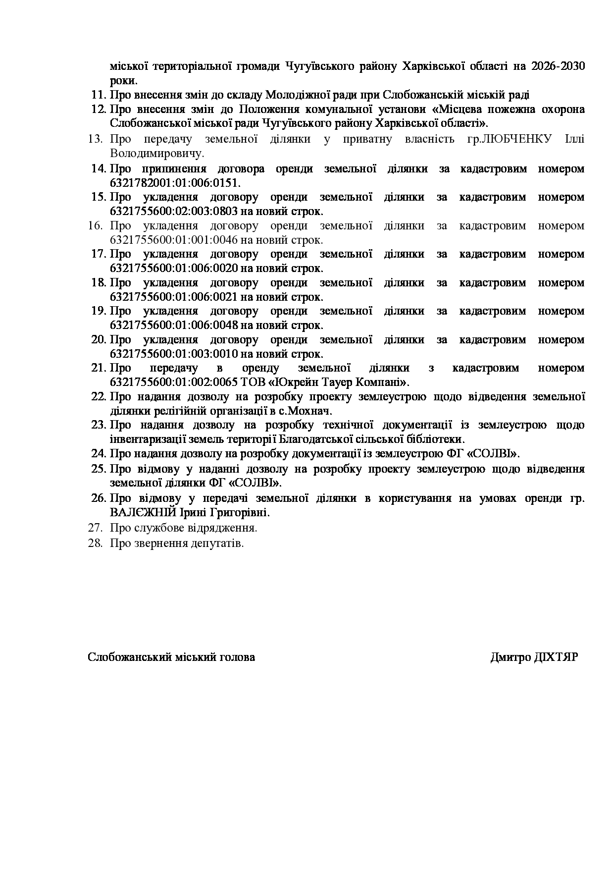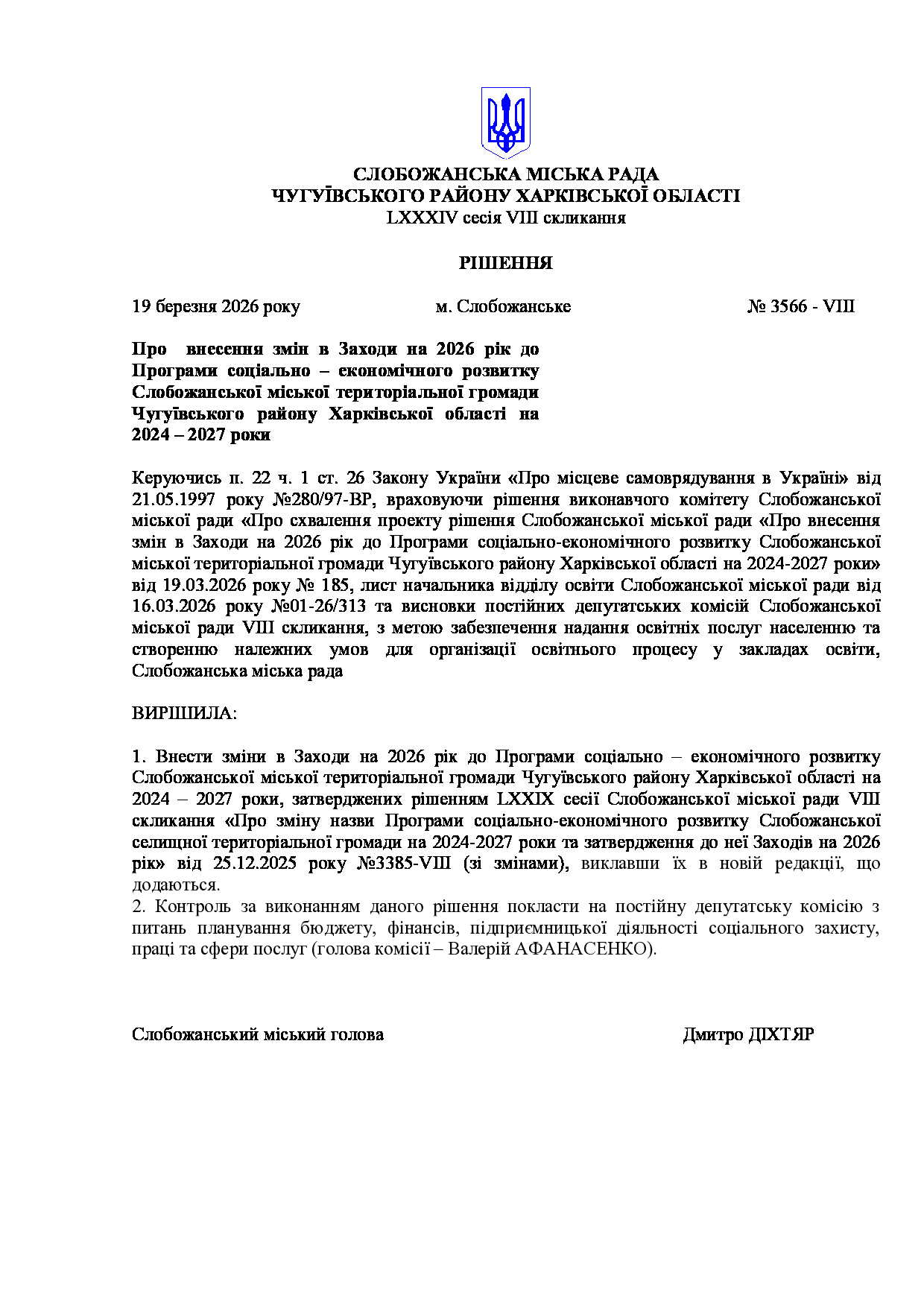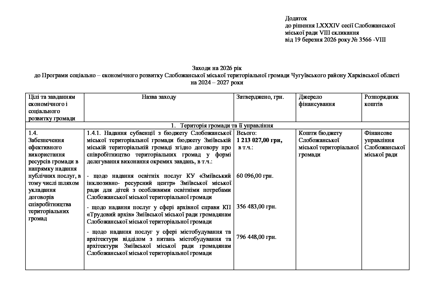 Текст рішення сесії №3566 Про внесення змін в Заходи на 2026 рік до Програми соціально – економічного розвитку Слобожанської міської територіальної громади Чугуївського району Харківської області на 2024 – 2027 роки