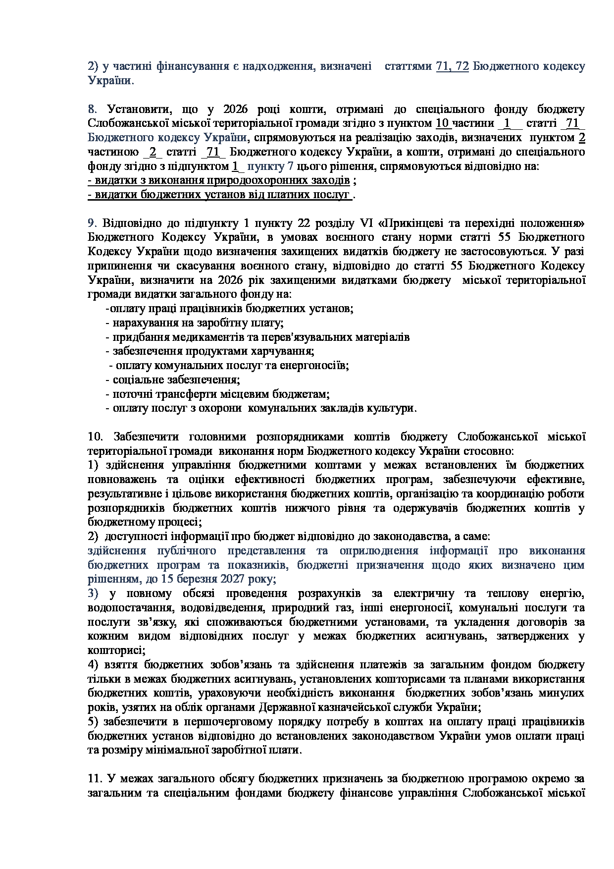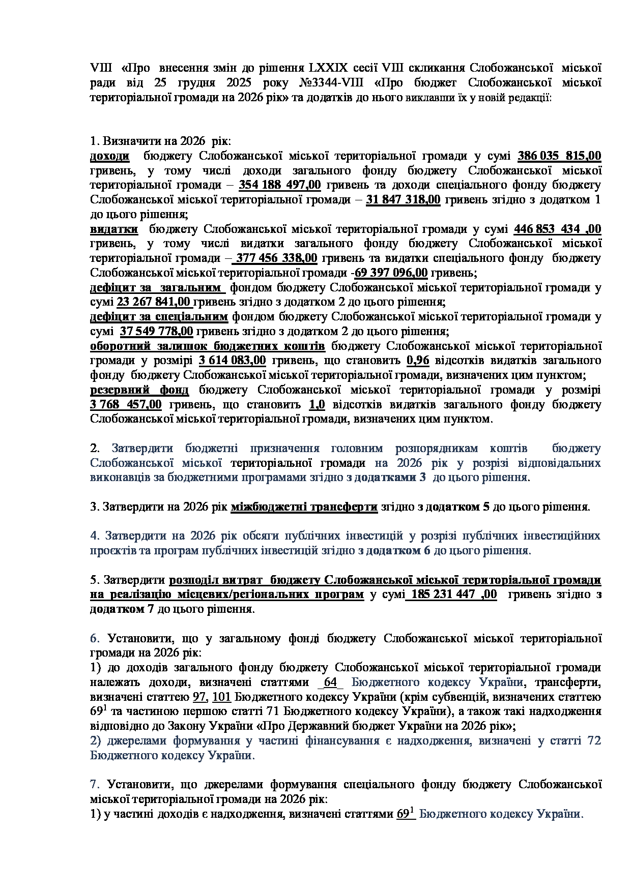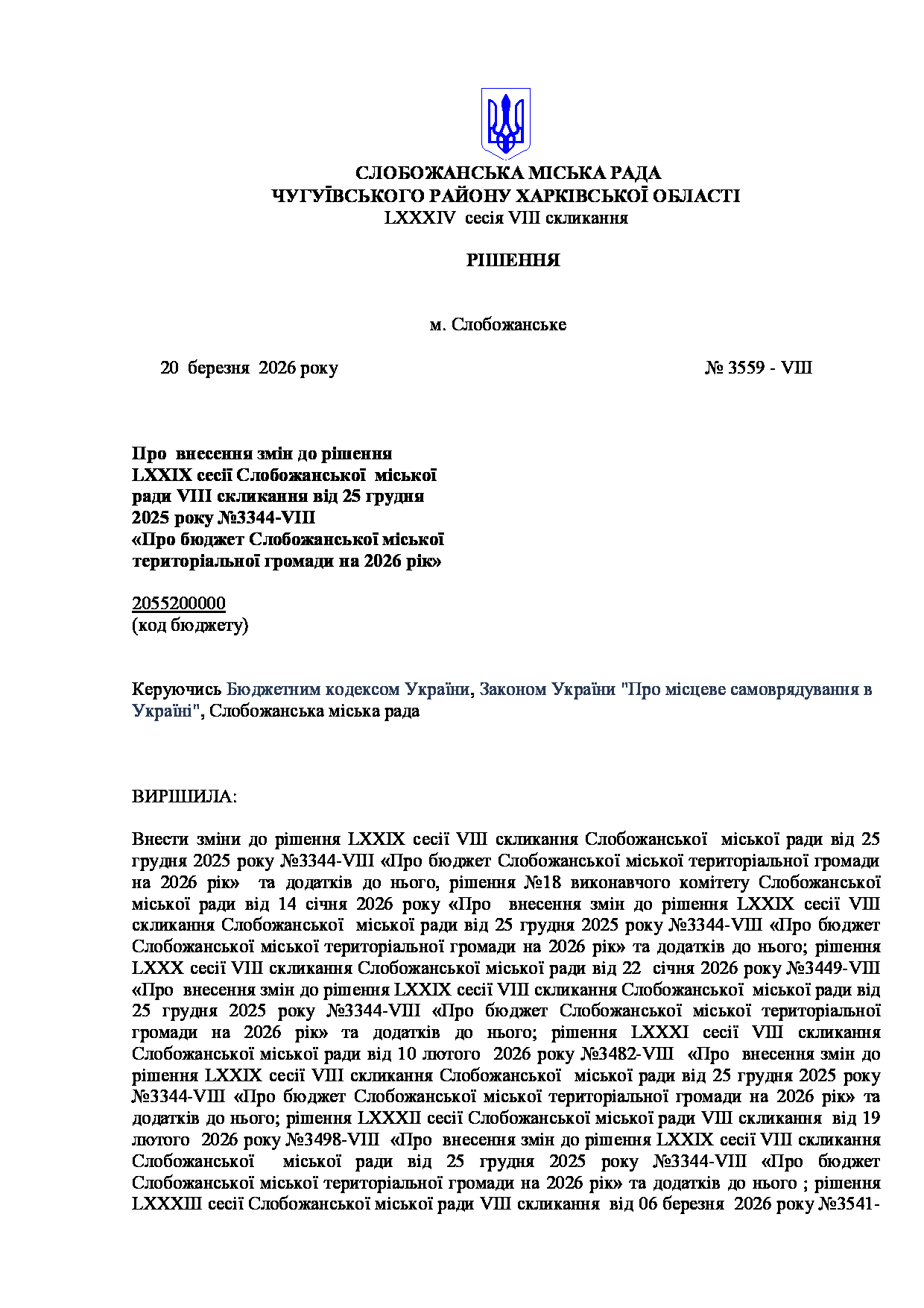 Текст рішення сесії №3559 Про внесення змін до рішення LXXIX сесії Слобожанської міської ради VIII скликання від 25 грудня 2025 року №3344-VIII «Про бюджет Слобожанської міської територіальної громади на 2026 рік»