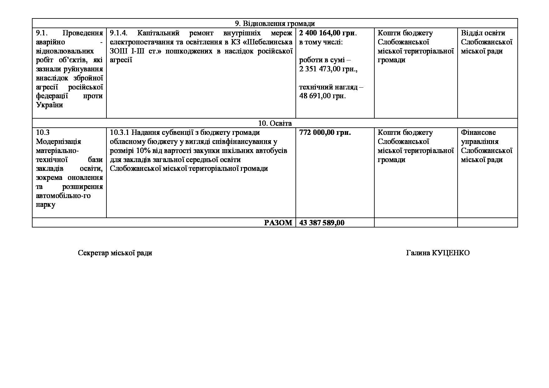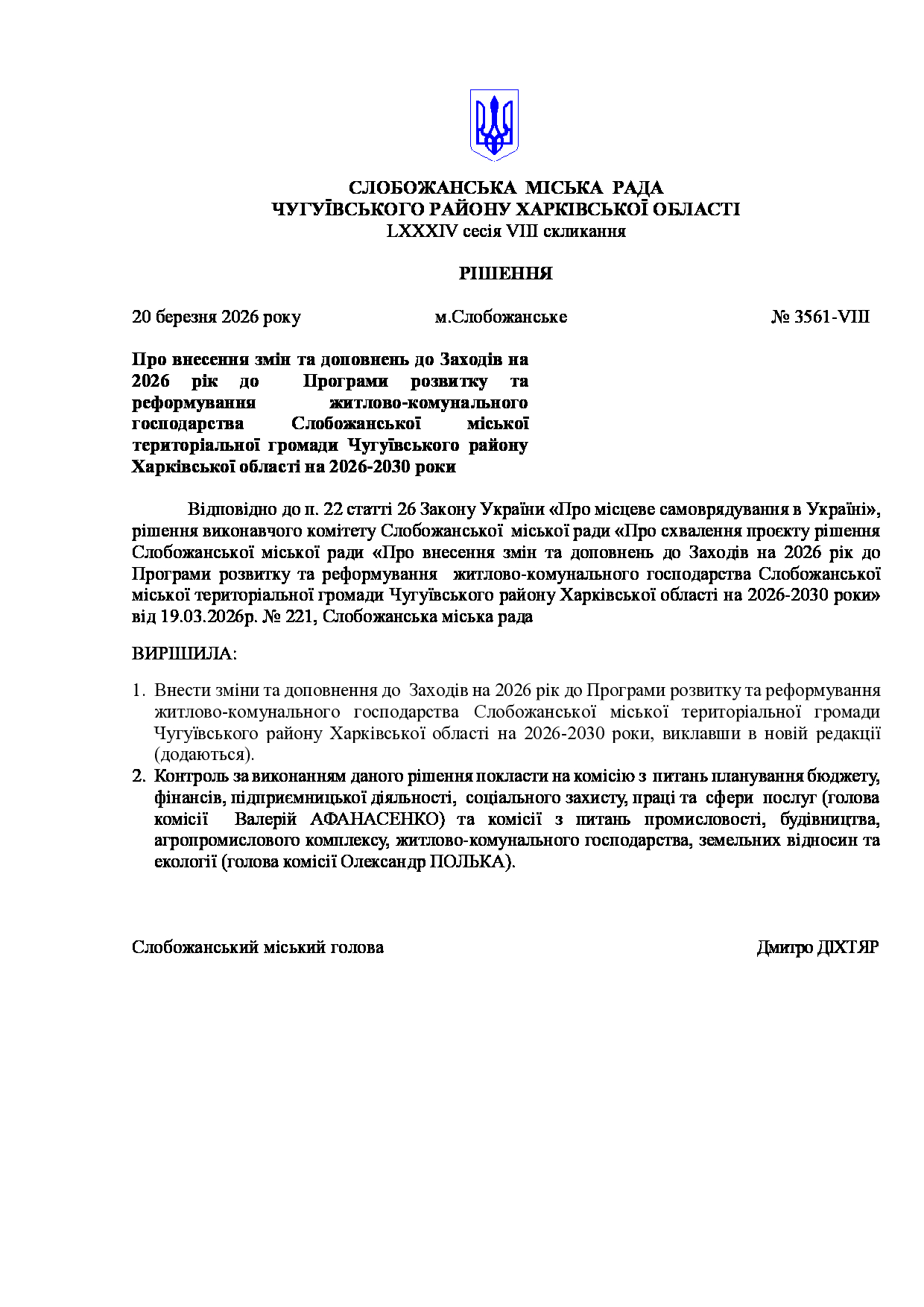 Текст рішення сесії №3561 Про внесення змін та доповнень до Заходів на 2026 рік до Програми розвитку та реформування житлово-комунального господарства Слобожанської міської територіальної громади Чугуївського району Харківської області на 2026-2030 роки