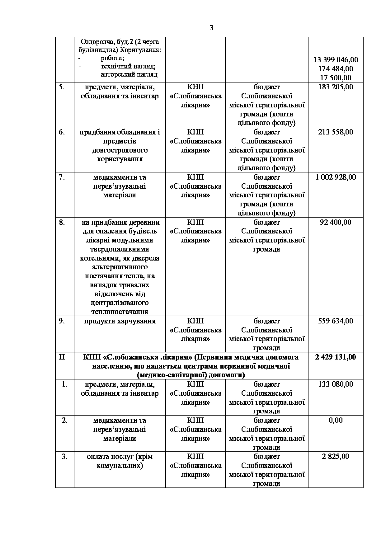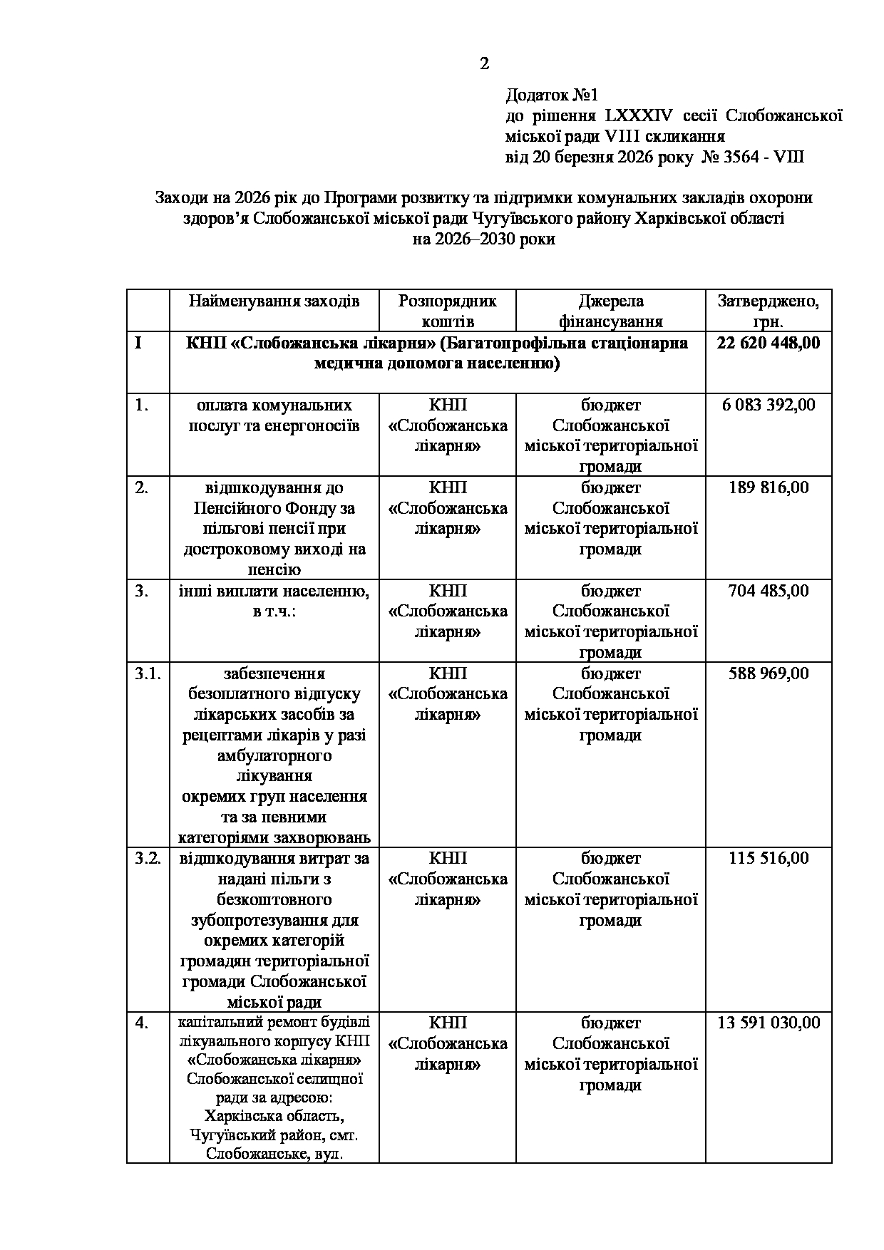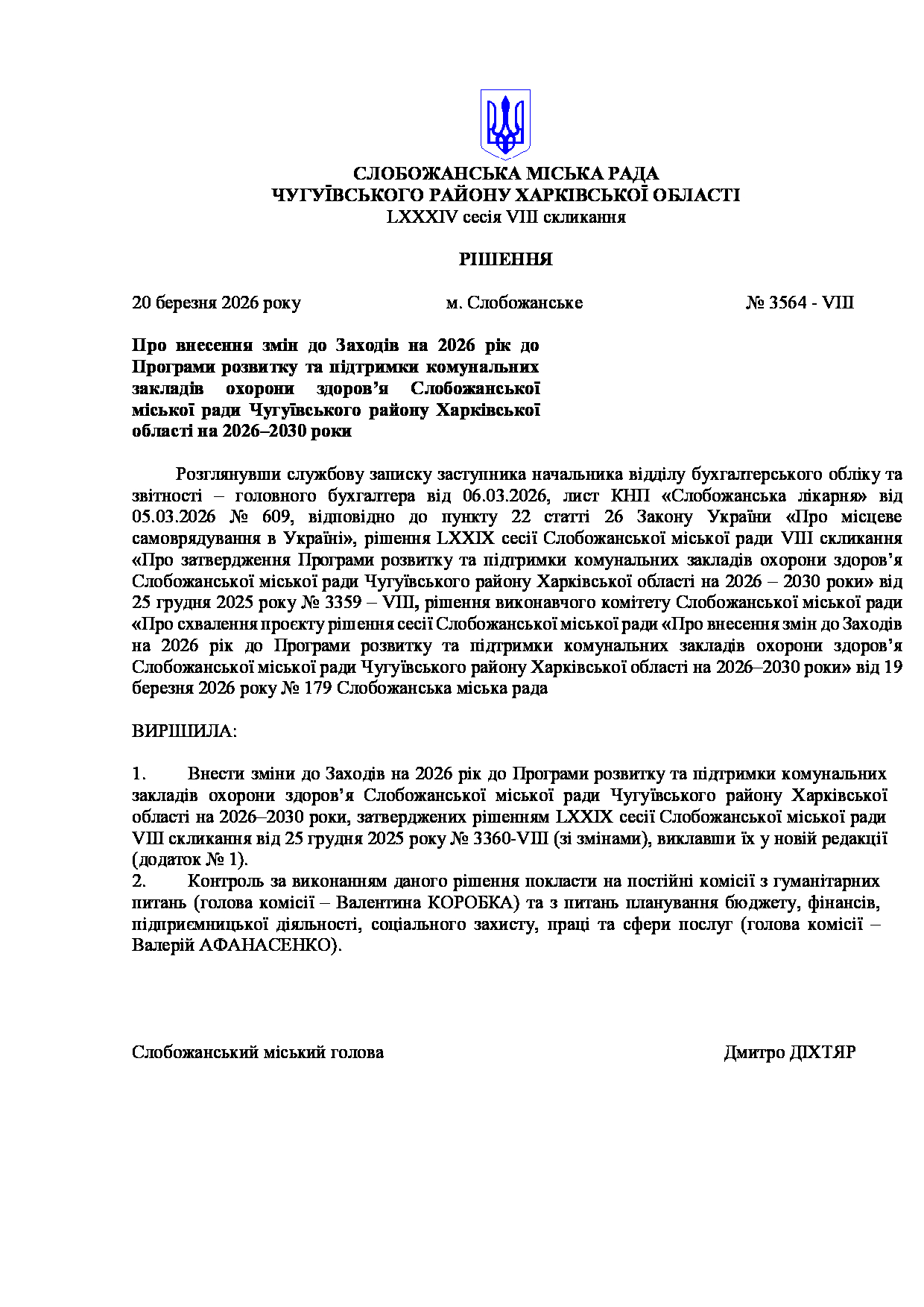 Текст рішення сесії №3564 Про внесення змін до Заходів на 2026 рік до Програми розвитку та підтримки комунальних закладів охорони здоров’я Слобожанської міської ради Чугуївського району Харківської області на 2026–2030 роки