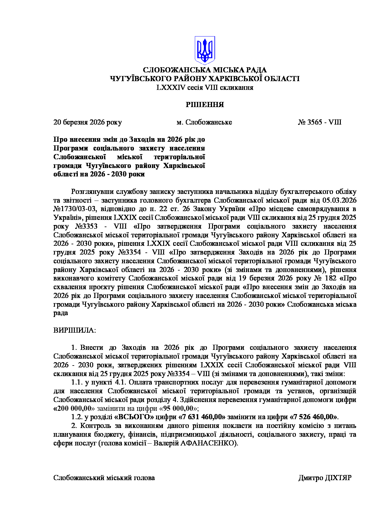 Текст рішення сесії №3565 Про внесення змін до Заходів на 2026 рік до Програми соціального захисту населення Слобожанської міської територіальної громади Чугуївського району Харківської області на 2026 - 2030 роки