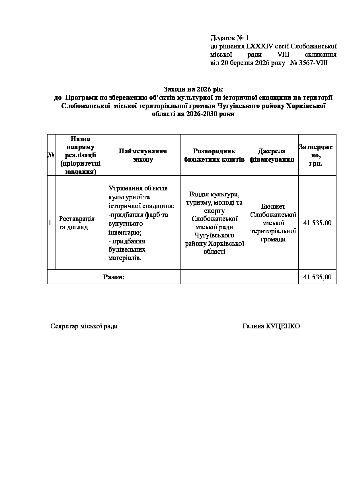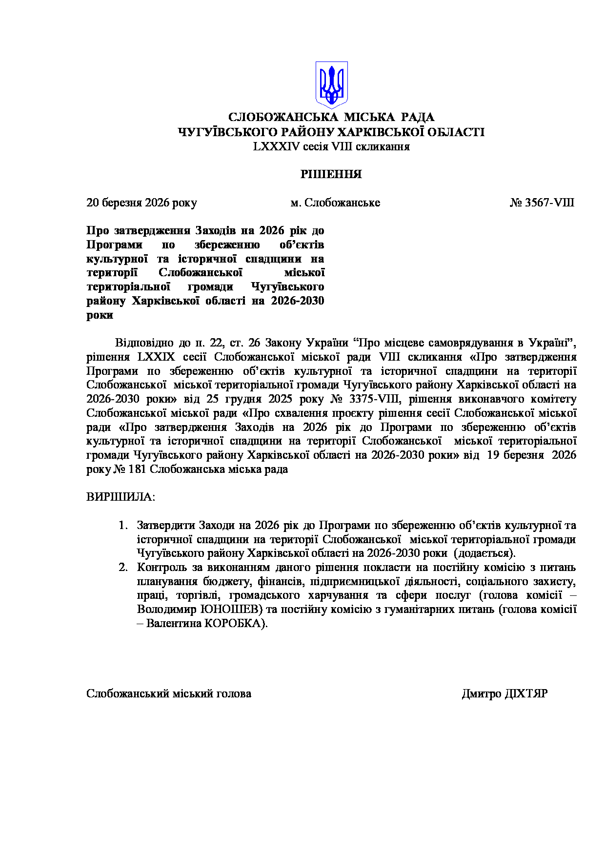 Текст рішення сесії №3567 Про затвердження Заходів на 2026 рік до Програми по збереженню об’єктів культурної та історичної спадщини на території Слобожанської міської територіальної громади Чугуївського району Харківської області на 2026-2030 роки
