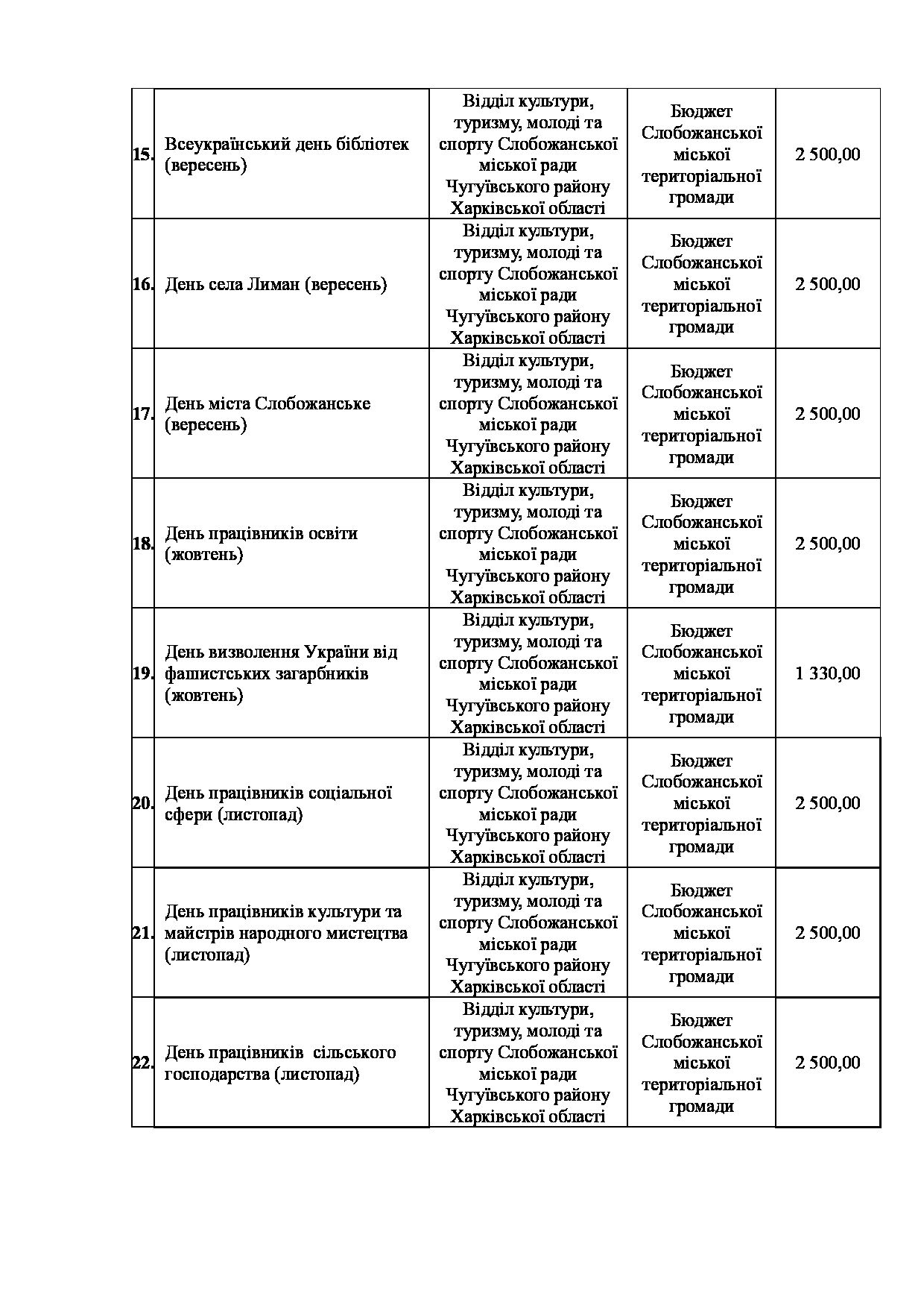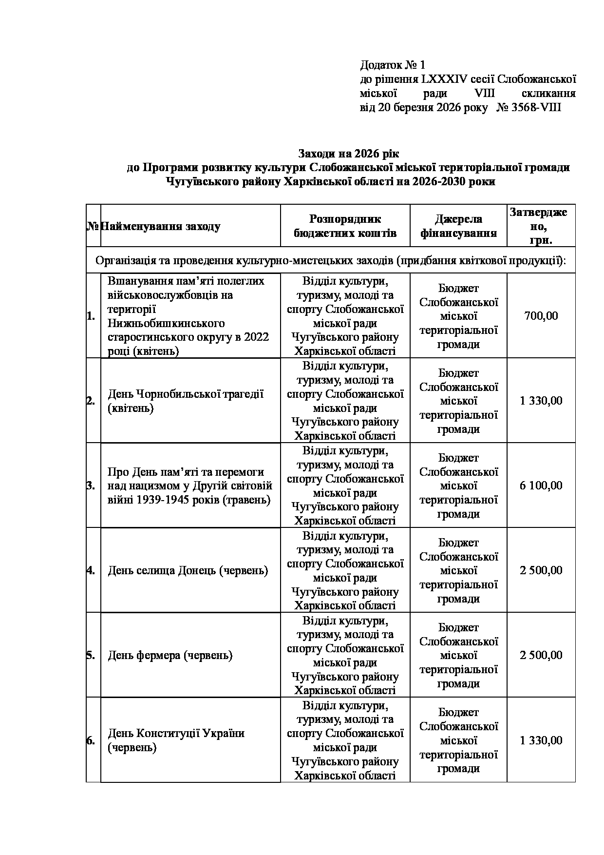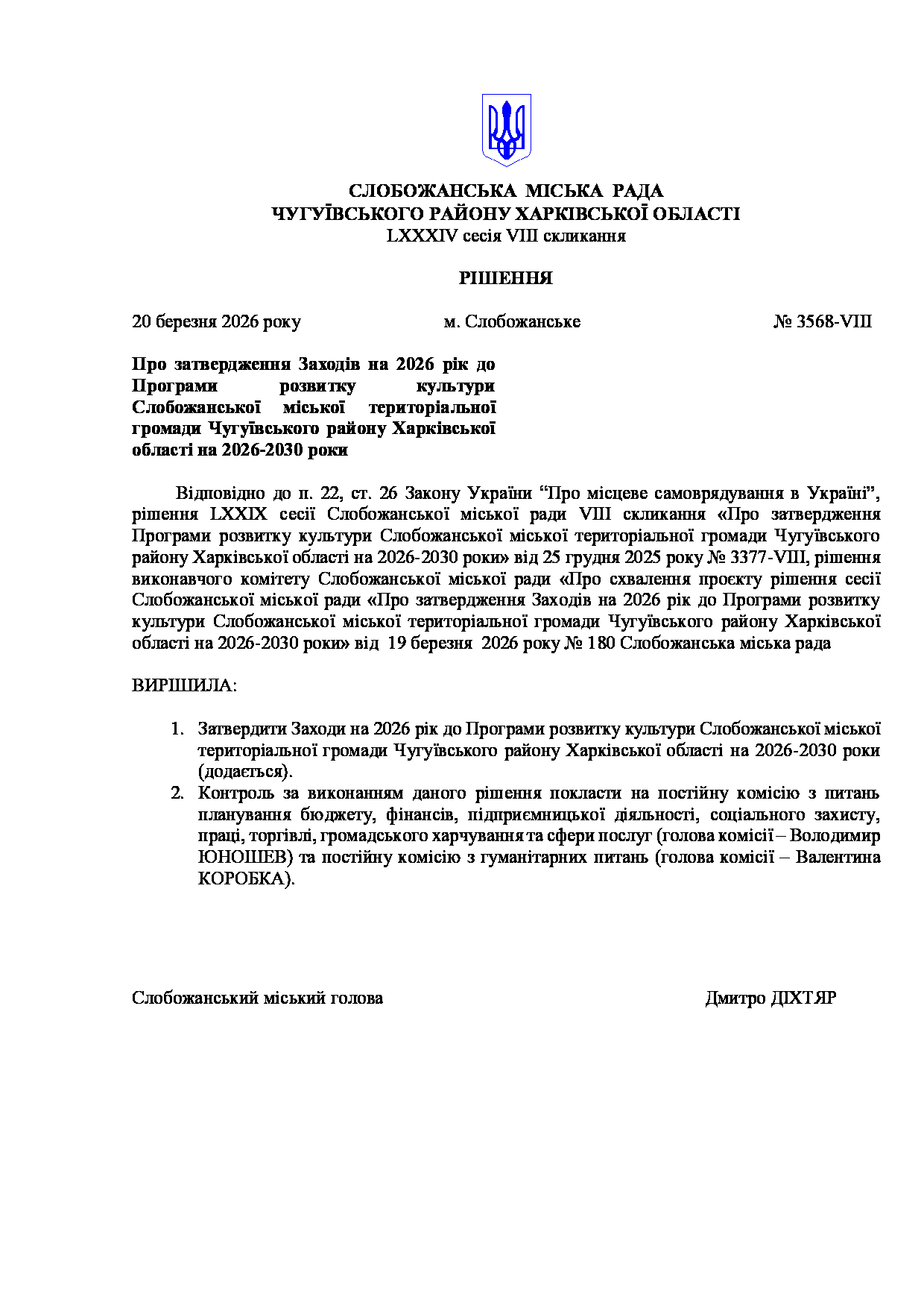 Текст рішення сесії №3568 Про затвердження Заходів на 2026 рік до Програми розвитку культури Слобожанської міської територіальної громади Чугуївського району Харківської області на 2026-2030 роки