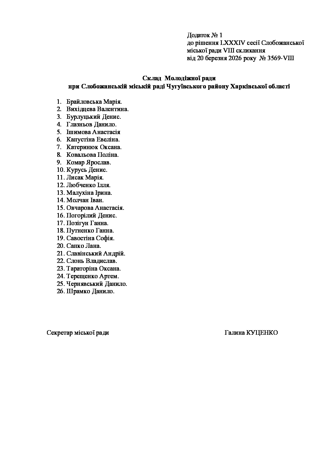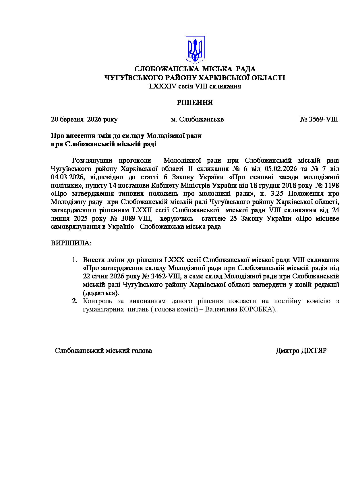 Текст рішення сесії №3569 Про внесення змін до складу Молодіжної ради при Слобожанській міській раді