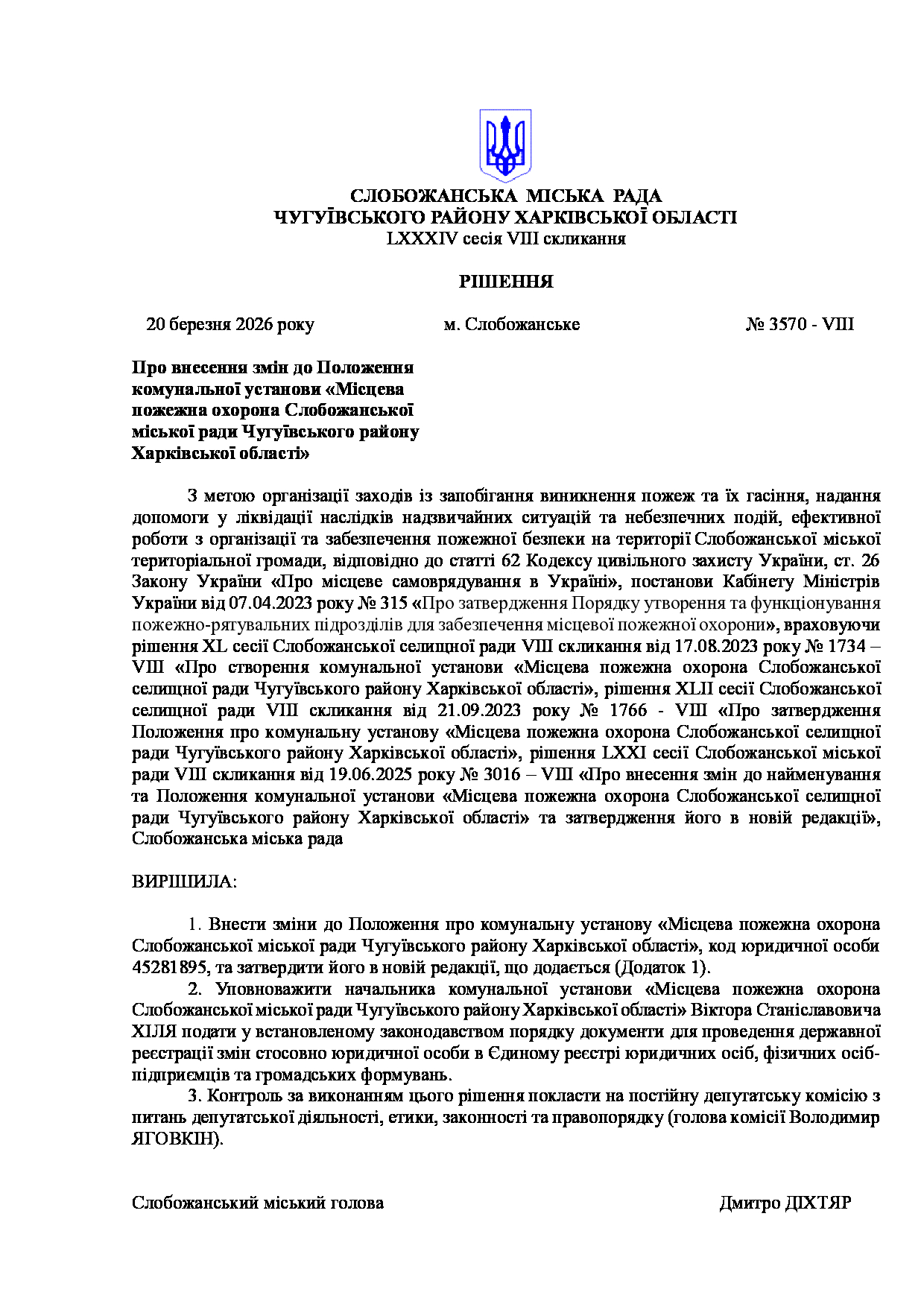 Текст рішення сесії №3570 Про внесення змін до Положення комунальної установи «Місцева пожежна охорона Слобожанської міської ради Чугуївського району Харківської області»