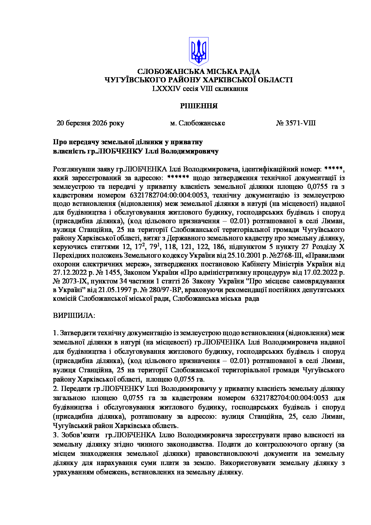 Текст рішення сесії №3571 Про передачу земельної ділянки у приватну власність гр.ЛЮБЧЕНКУ Іллі Володимировичу