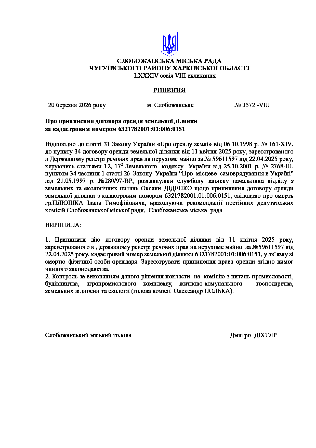 Текст рішення сесії №3572 Про припинення договора оренди земельної ділянки за кадастровим номером 6321782001:01:006:0151