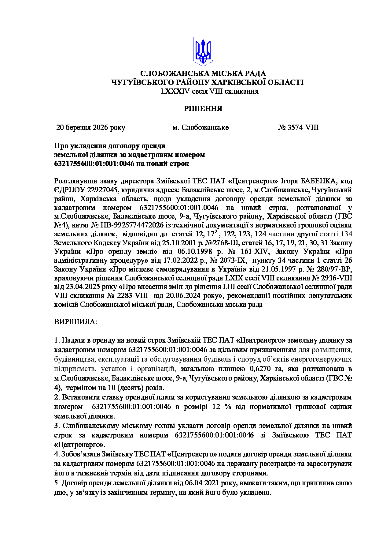 Текст рішення сесії №3574 Про укладення договору оренди земельної ділянки за кадастровим номером 6321755600:01:001:0046 на новий строк