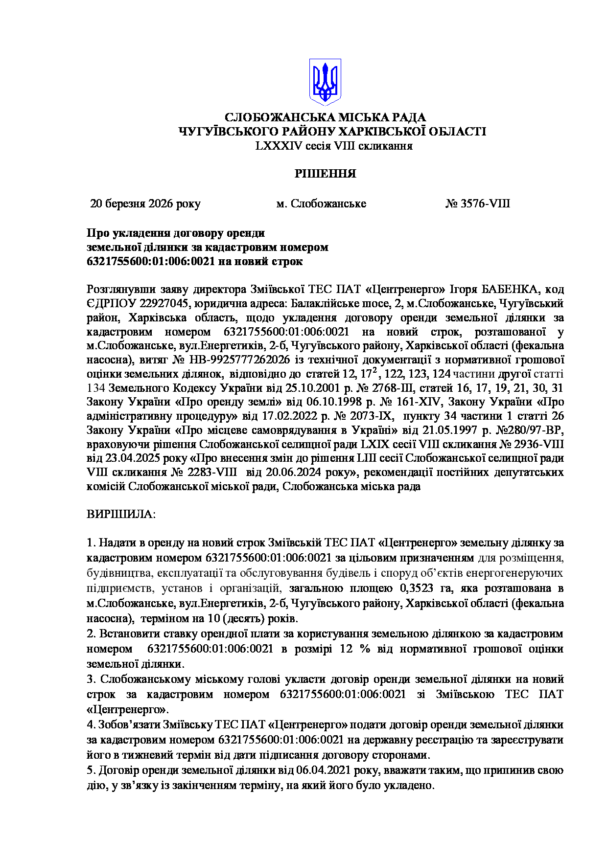 Текст рішення сесії №3576 Про укладення договору оренди земельної ділянки за кадастровим номером 6321755600:01:006:0021 на новий строк