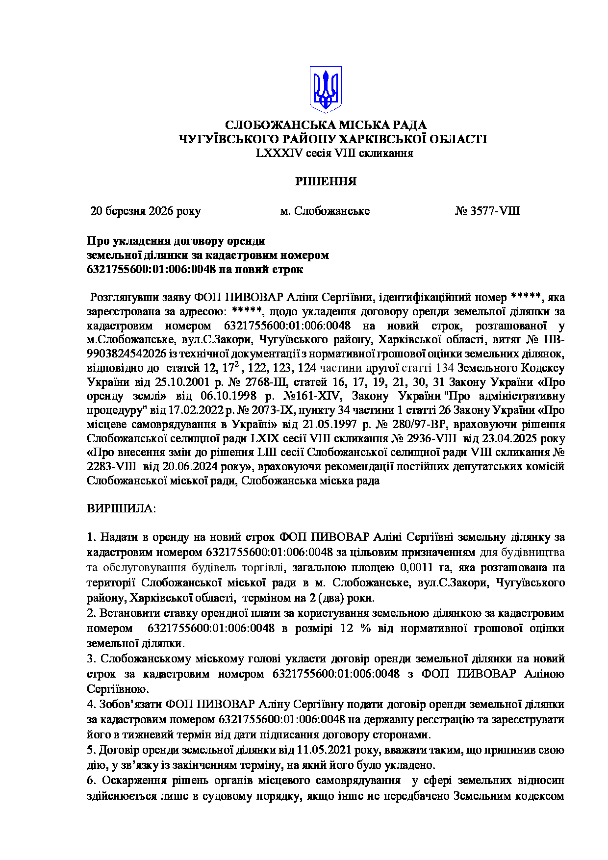 Текст рішення сесії №3577 Про укладення договору оренди земельної ділянки за кадастровим номером 6321755600:01:006:0048 на новий строк