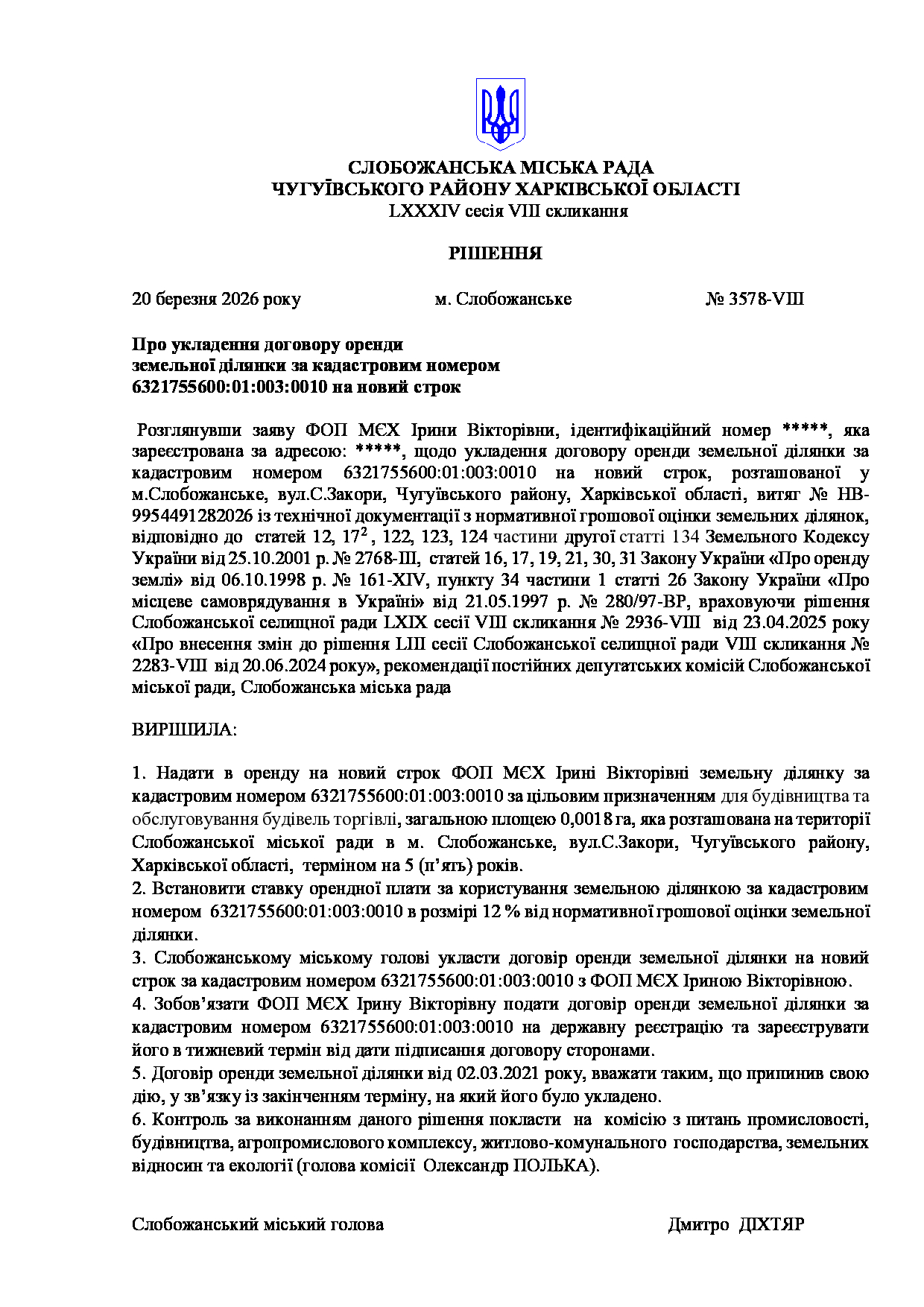 Текст рішення сесії №3578 Про укладення договору оренди земельної ділянки за кадастровим номером 6321755600:01:003:0010 на новий строк