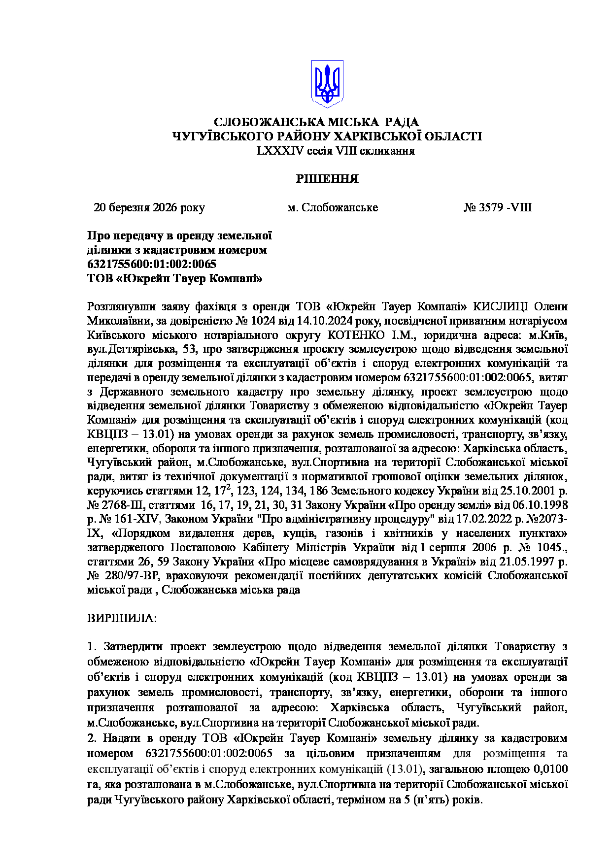 Текст рішення сесії №3579 Про передачу в оренду земельної ділянки з кадастровим номером 6321755600:01:002:0065 ТОВ «Юкрейн Тауер Компані»