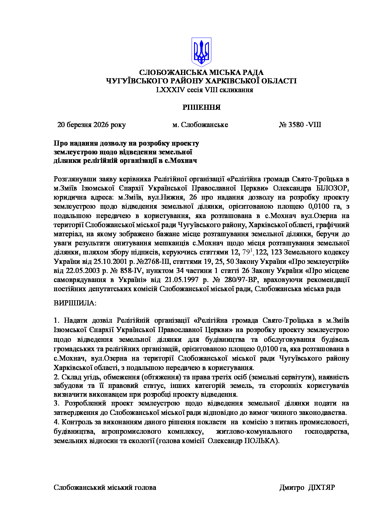 Текст рішення сесії №3580 Про надання дозволу на розробку проекту землеустрою щодо відведення земельної ділянки релігійній організації в с.Мохнач