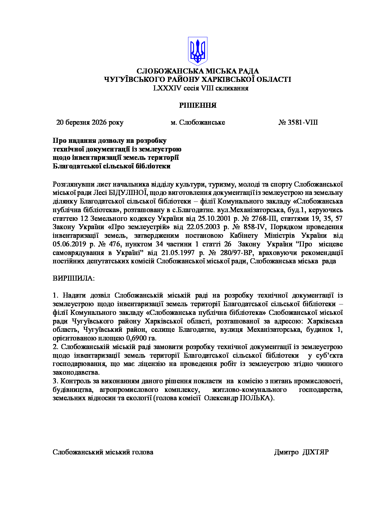 Текст рішення сесії №3581 Про надання дозволу на розробку технічної документації із землеустрою щодо інвентаризації земель території Благодатської сільської бібліотеки