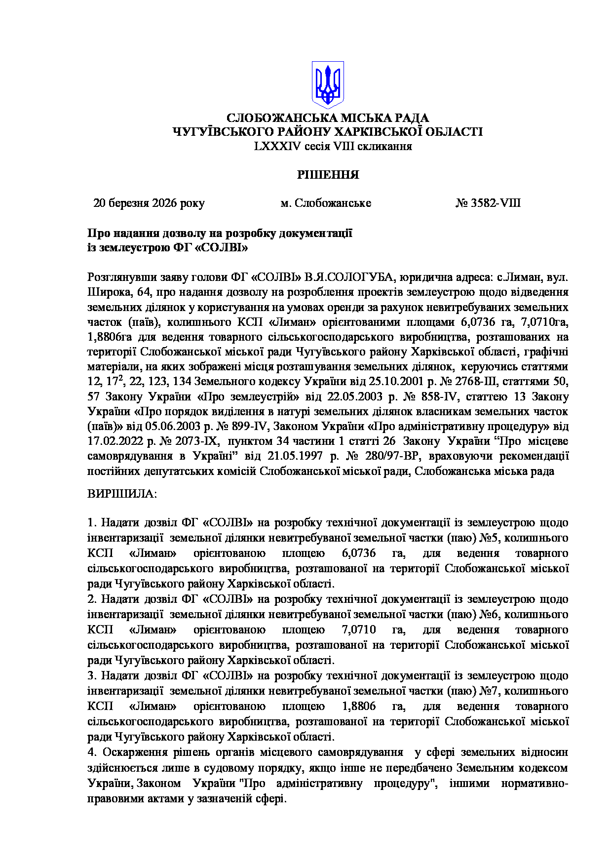 Текст рішення сесії №3582 Про надання дозволу на розробку документації із землеустрою ФГ «СОЛВІ»
