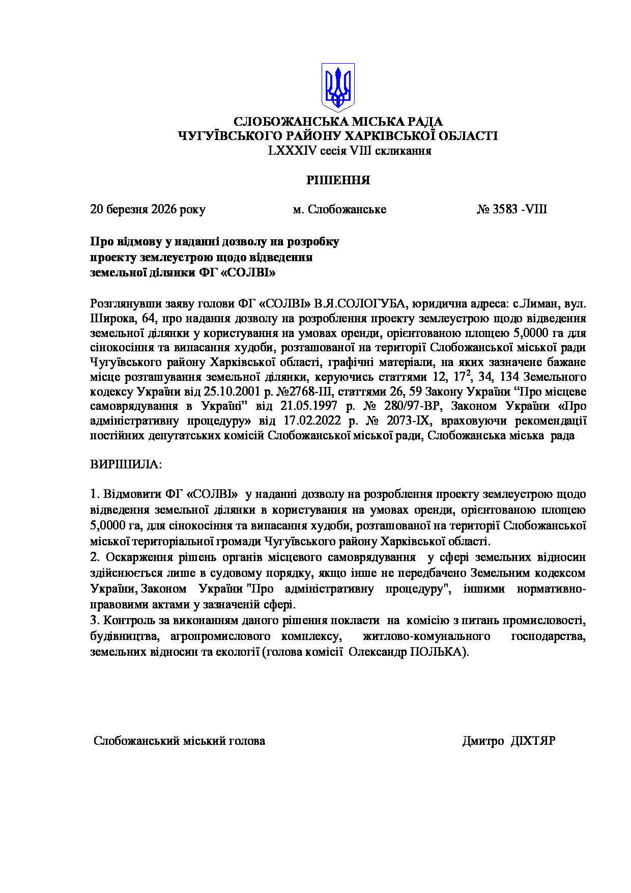 Текст рішення сесії №3583 Про відмову у наданні дозволу на розробку проекту землеустрою щодо відведення земельної ділянки ФГ «СОЛВІ»