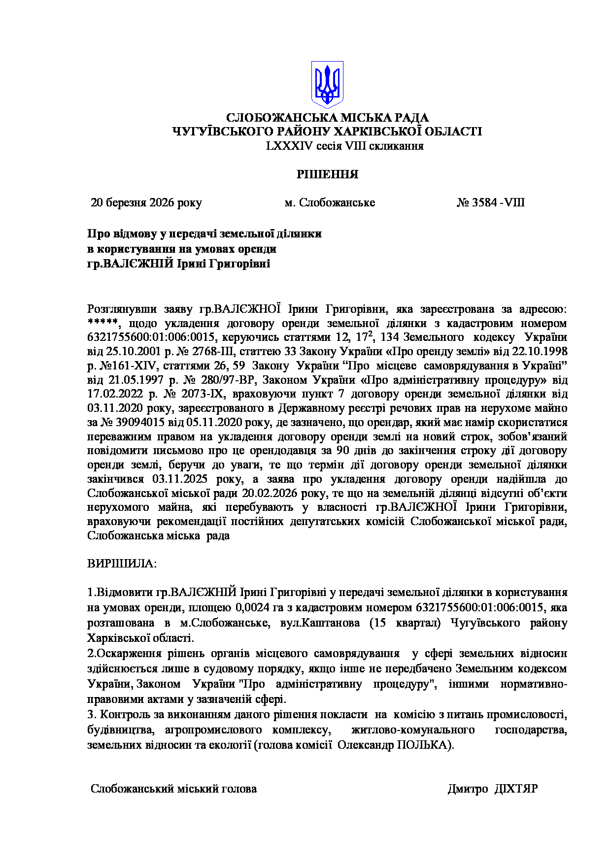 Текст рішення сесії №3584 Про відмову у передачі земельної ділянки в користування на умовах оренди гр. ВАЛЄЖНІЙ Ірині Григорівні