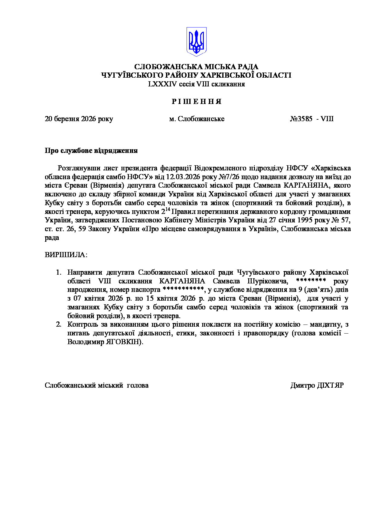 Текст рішення сесії №3585 Про службове відрядження