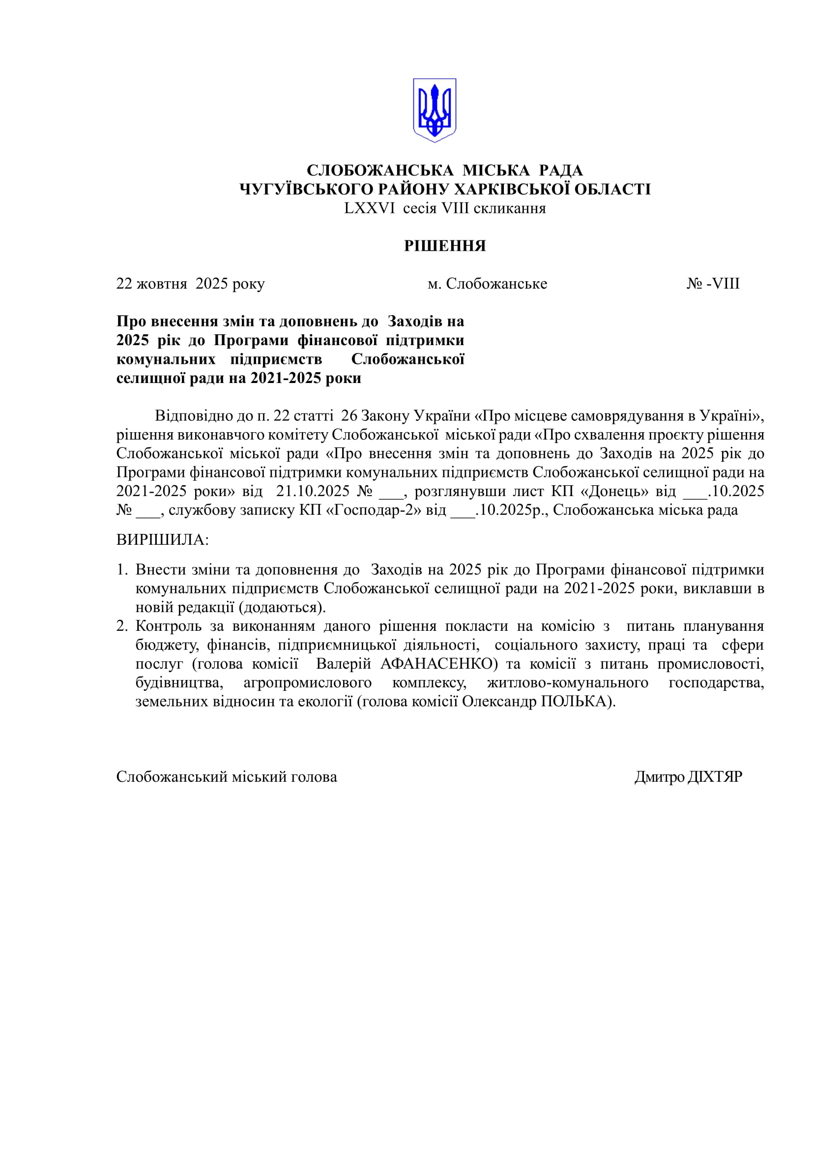 Текст проекту рішення сесії №039 Про внесення змін та доповнень до Заходів на 2025 рік до Програми фінансової підтримки комунальних підприємств Слобожанської селищної ради на 2021-2025 роки