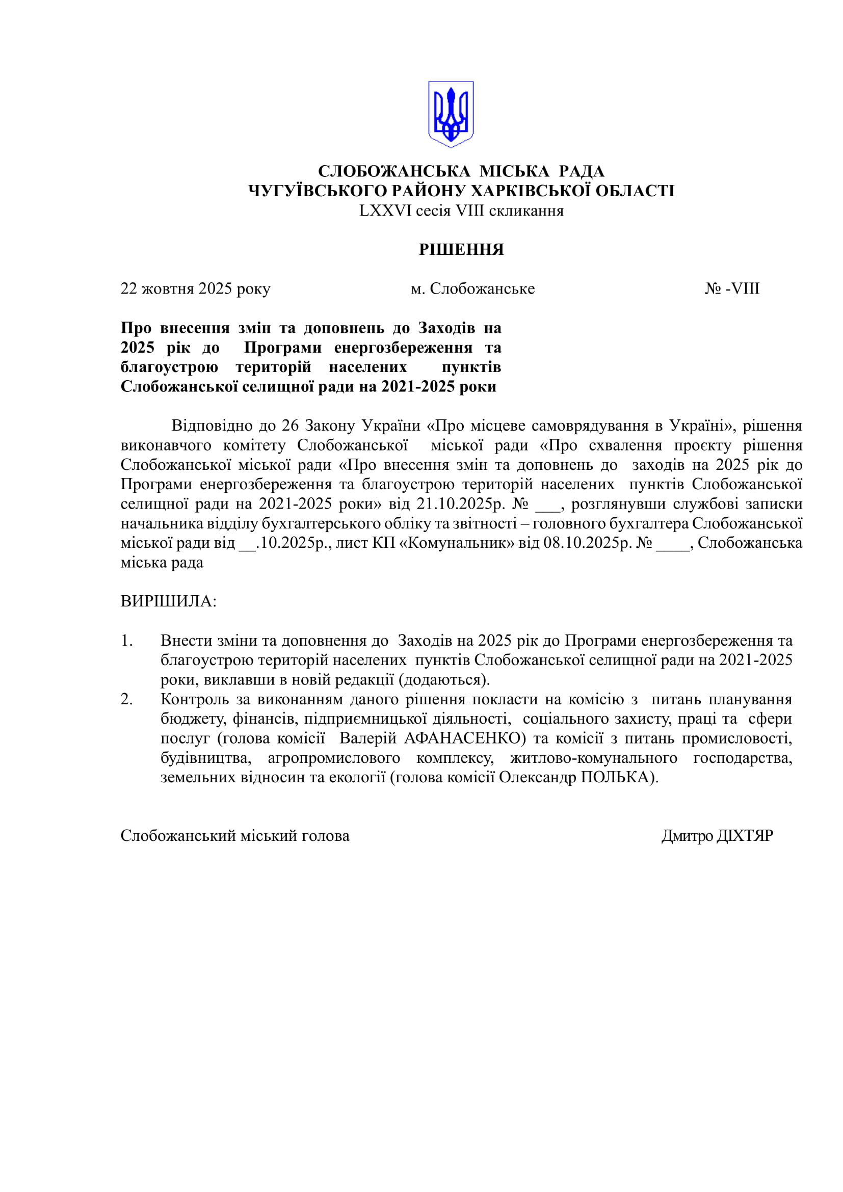 Текст проекту рішення сесії №041 Про внесення змін та доповнень до Заходів на 2025 рік до Програми енергозбереження та благоустрою територій населених пунктів Слобожанської селищної ради на 2021-2025 роки