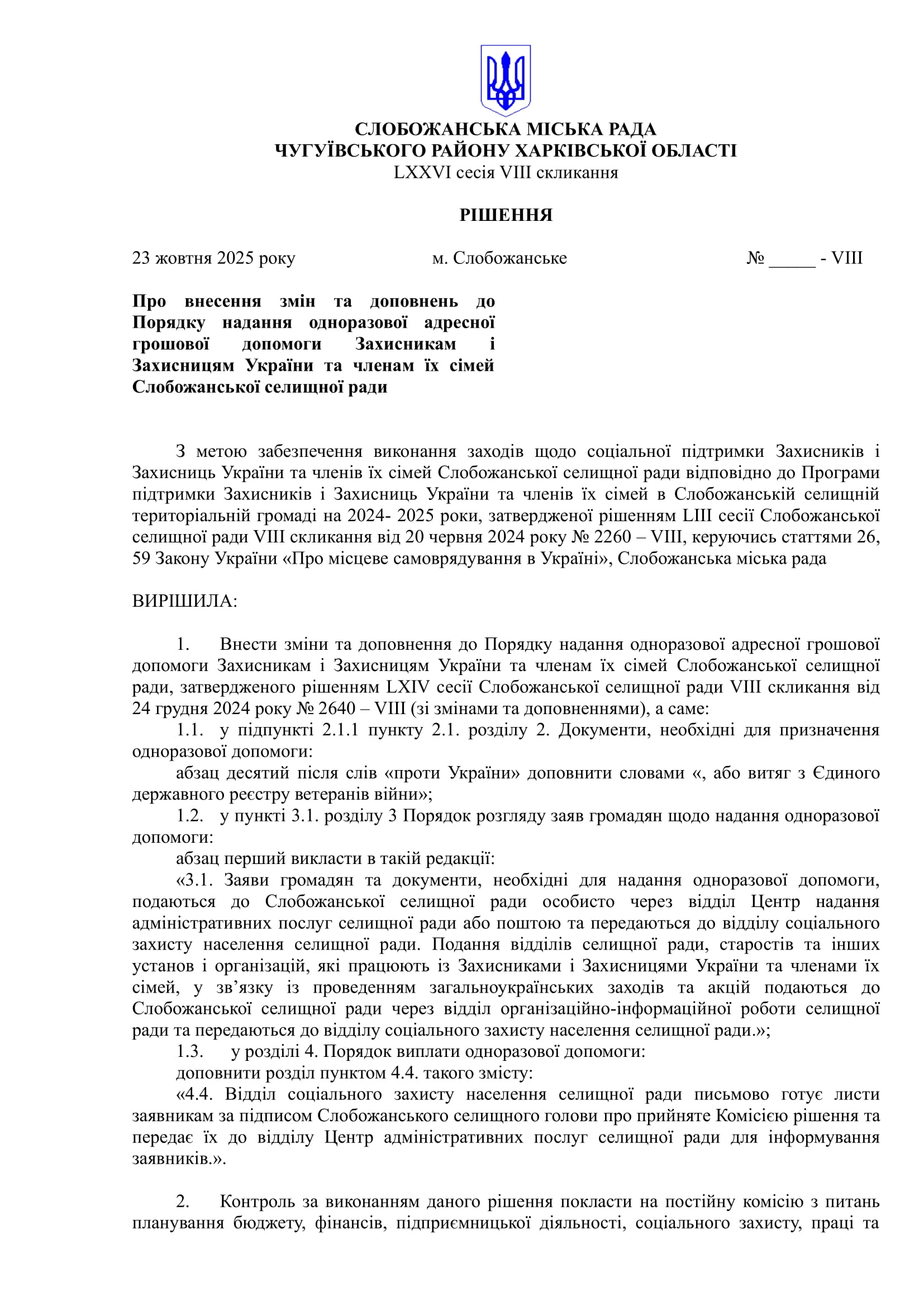 Текст проекту рішення сесії №025 Про внесення змін та доповнень до Порядку надання одноразової адресної грошової допомоги громадянам Слобожанської селищної ради.