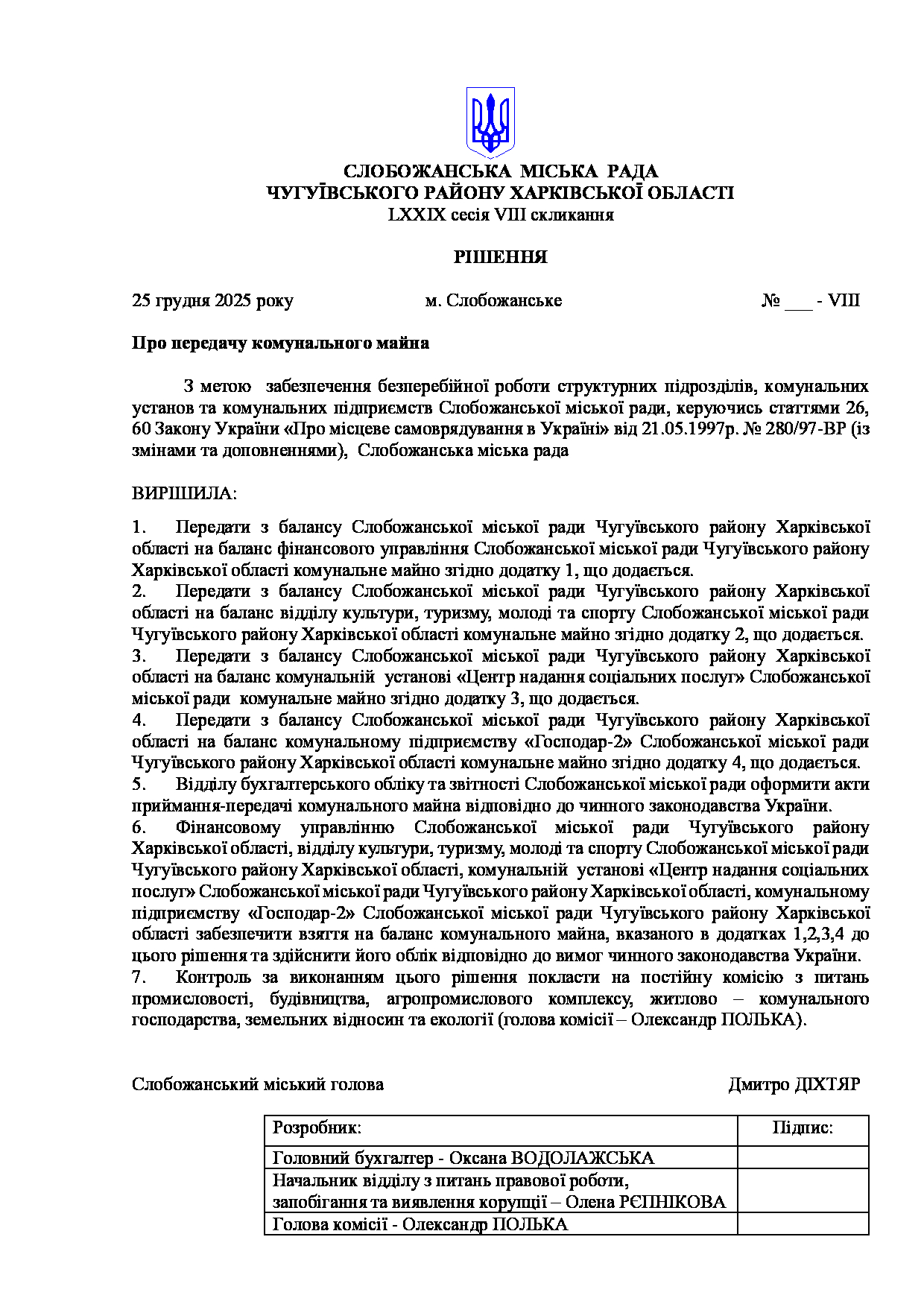 Текст проекту рішення сесії №074 Про затвердження штатного розпису комунального підприємства «Комунальник» Слобожанської міської ради Чугуївського району Харківської області