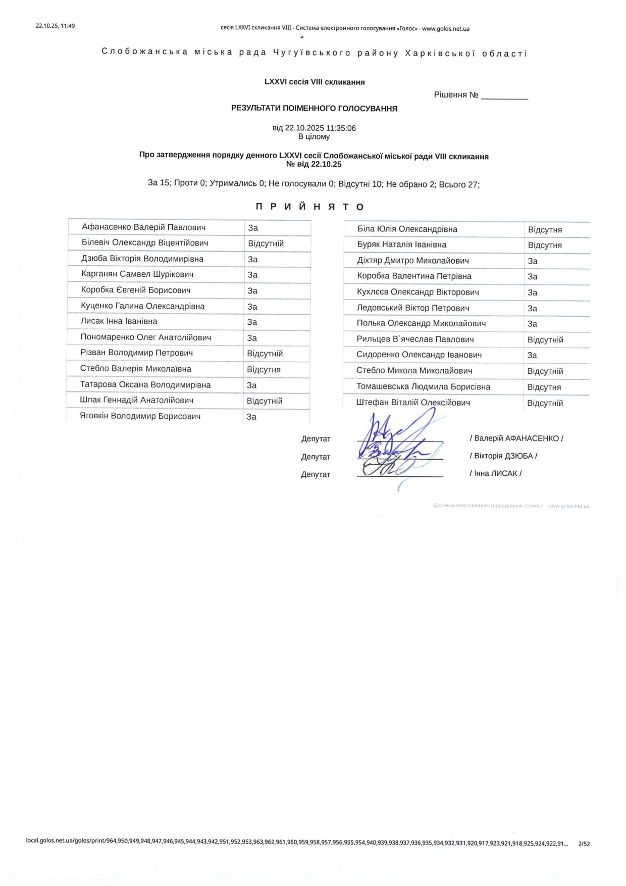 Відомості голосування до рішення сесії №3234 Про затвердження звіту «Про виконання бюджету Слобожанської селищної територіальної громади за 9 місяців 2025 року».