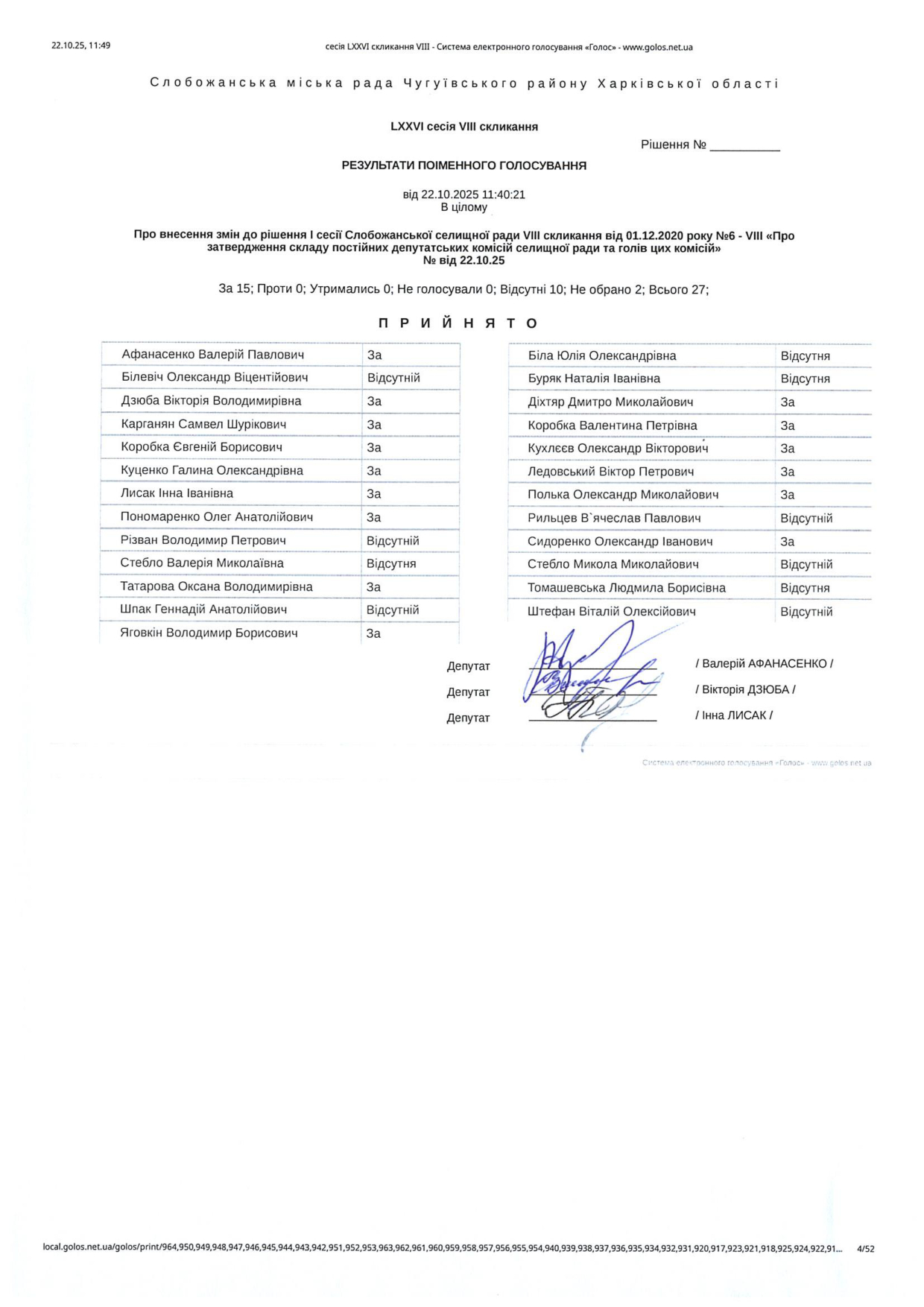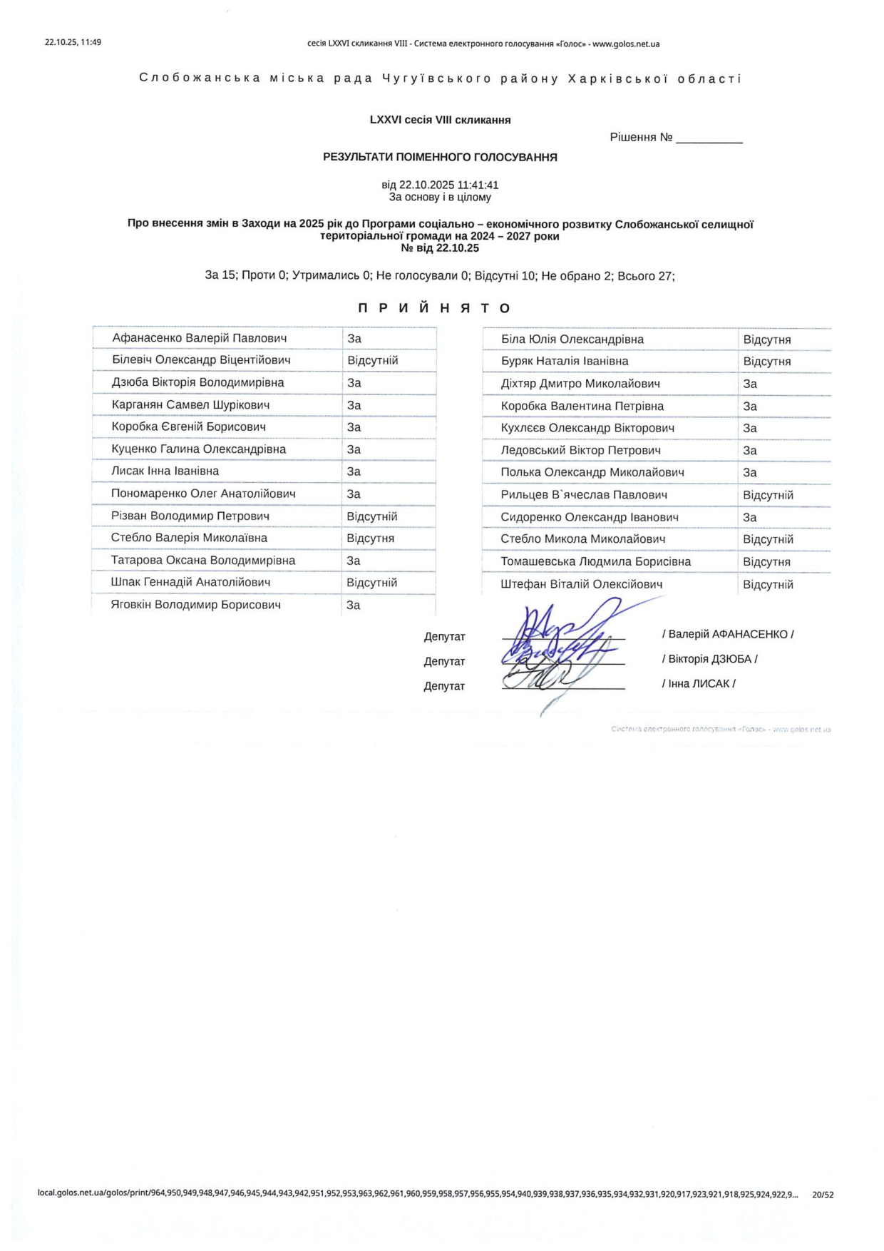 Відомості голосування до рішення сесії №3249 Про внесення змін в Заходи на 2025 рік до Програми соціально – економічного розвитку Слобожанської селищної територіальної громади на 2024 – 2027 роки.