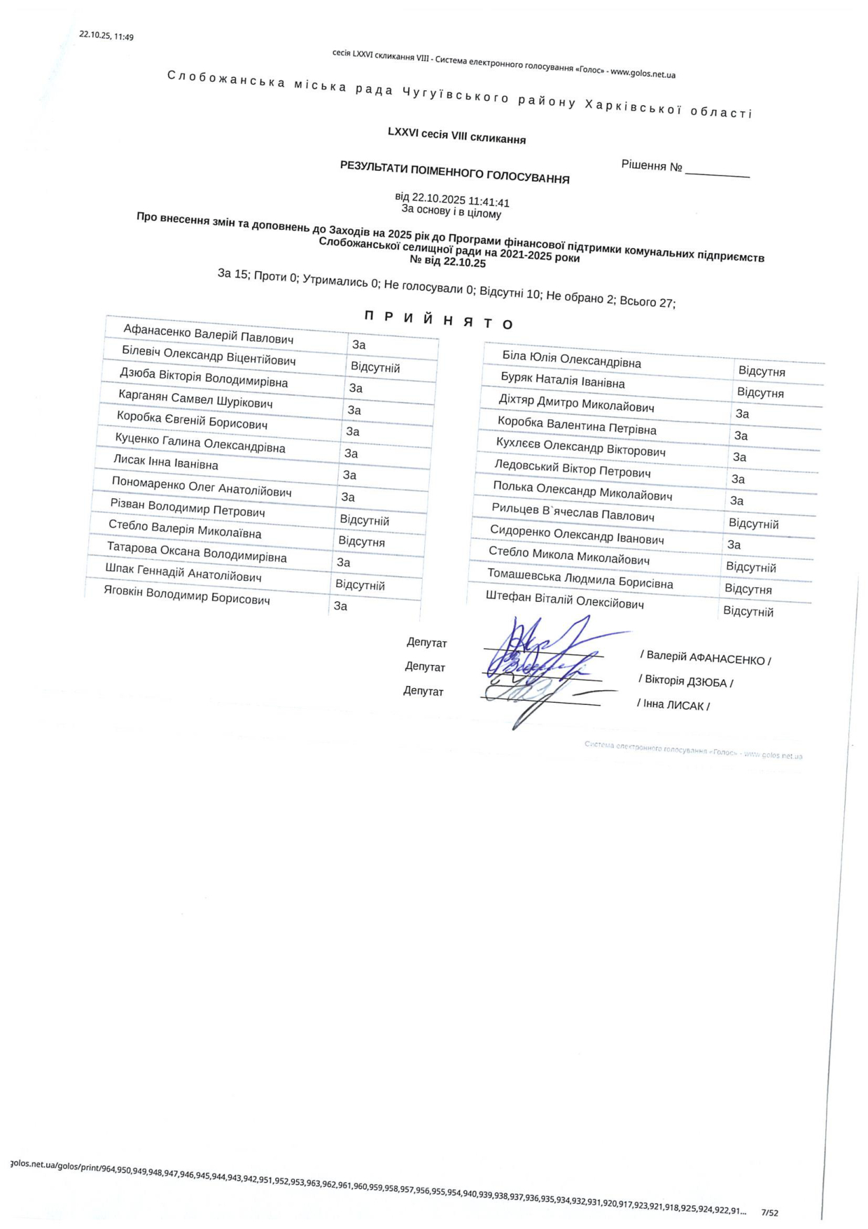 Відомості голосування до рішення сесії №3236 Про внесення змін та доповнень до Заходів на 2025 рік до Програми фінансової підтримки комунальних підприємств Слобожанської селищної ради на 2021-2025 роки.