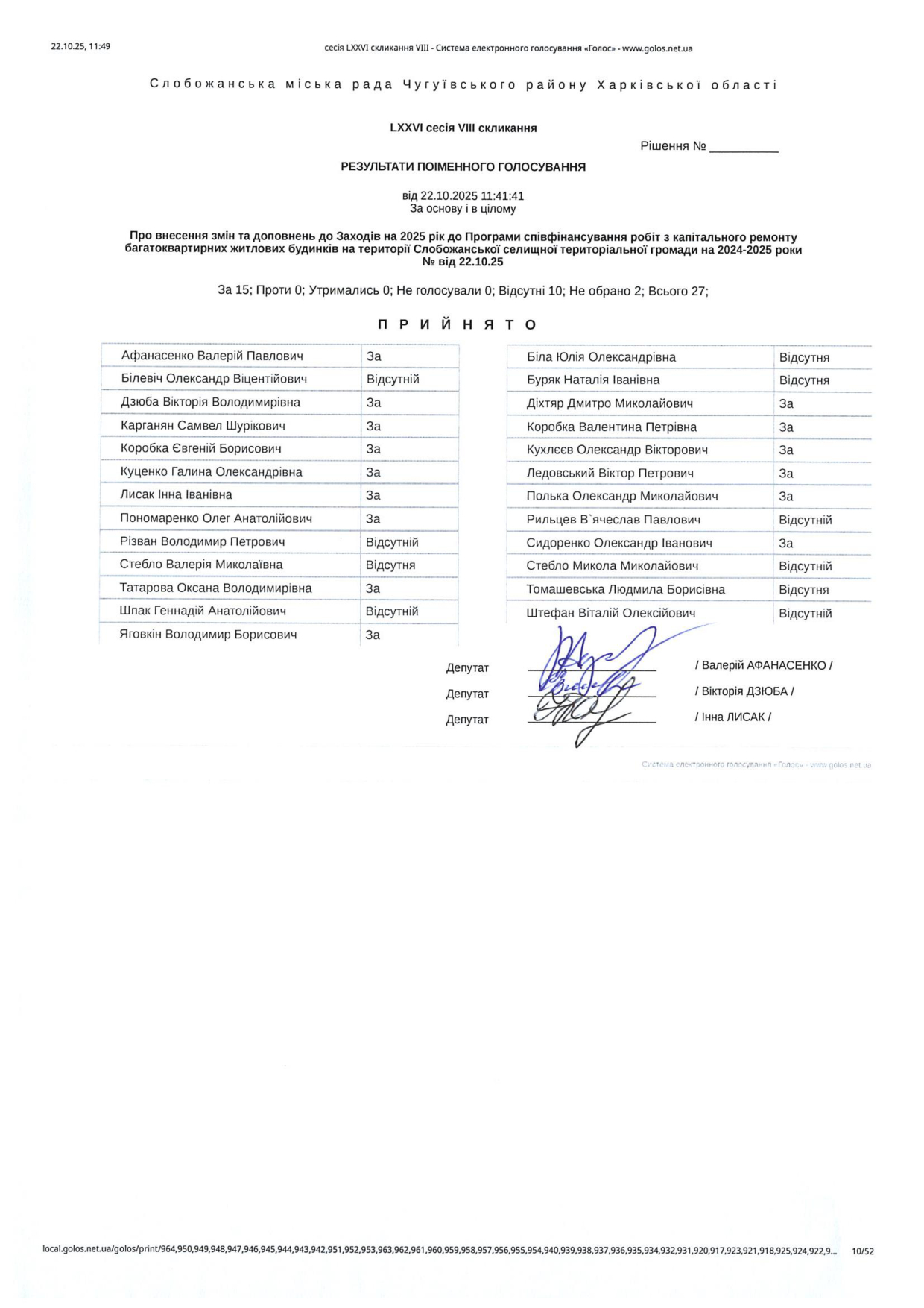 Відомості голосування до рішення сесії №3239 Про внесення змін та доповнень до Заходів на 2025 рік до Програми співфінансування робіт з капітального ремонту багатоквартирних житлових будинків на території Слобожанської селищної територіальної громади на 2024-2025 роки.