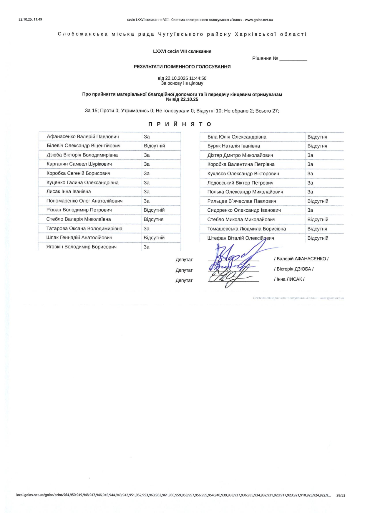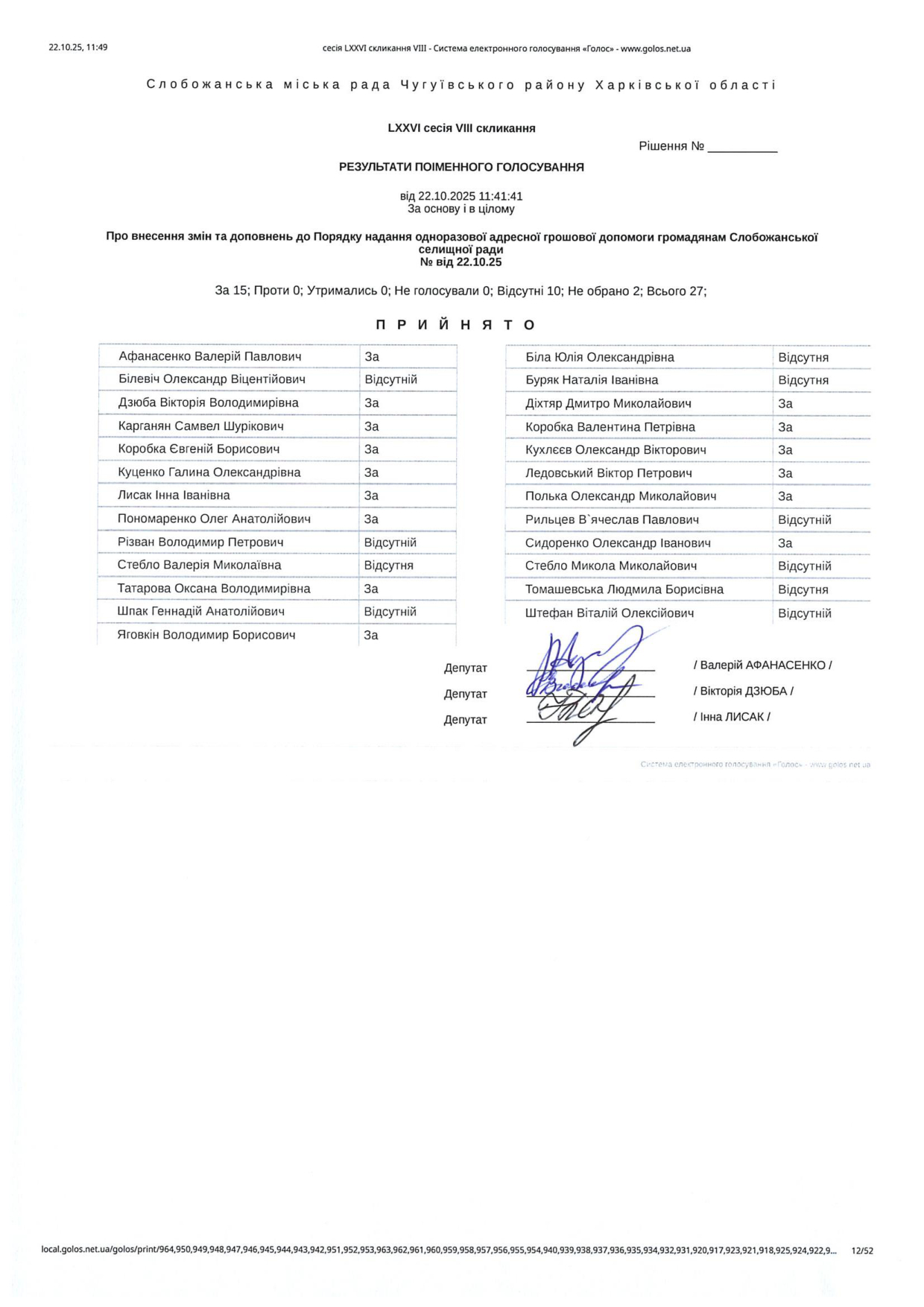 Відомості голосування до рішення сесії №3243 Про внесення змін та доповнень до Порядку надання одноразової адресної грошової допомоги Захисникам і Захисницям України та членам їх сімей Слобожанської селищної ради.